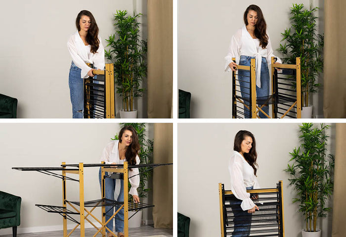 Ta wyjątkowa suszarka ma 4 boczne skrzydła na 2 poziomach. Możesz jej używać bez bocznych skrzydeł, częściowo rozłożoną lub w pełni rozłożoną. W ten sposób możesz łatwo suszyć bieliznę, ubrania dziecięce, ściereczki kuchenne czy dłuższe koszule i spodnie bez dotykania ziemi.