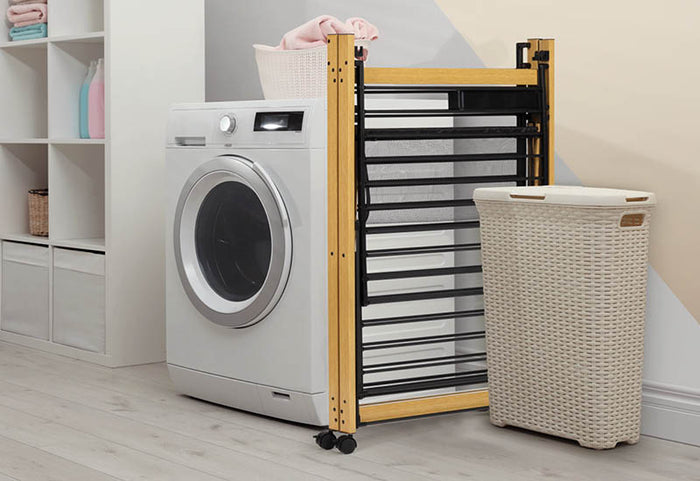 Możesz łatwo ustawić suszarkę według potrzebnej przestrzeni. Gdy pranie jest suche, po prostu złóż boczne skrzydła i złóż suszarkę. Po złożeniu suszarka ma tylko 11 cm szerokości, więc możesz ją przechowywać gdziekolwiek, nawet w najmniejszych przestrzeniach. Unikalną cechą jest to, że stoi samodzielnie po złożeniu – idealna do przechowywania za szafą, przy ścianie lub w wąskim korytarzu.