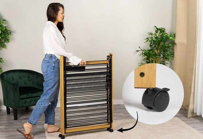 Dzięki unikalnemu designowi, ta suszarka na pranie jest bardzo stabilna, więc nie musisz się martwić o jej przewrócenie. Dzięki łatwemu przemieszczaniu się na 4 kółkach, możesz przesuwać suszarkę gdziekolwiek chcesz, nawet na taras. Specjalna funkcja blokady kółek zapewnia, że suszarka pozostaje na miejscu, więc nie zostanie przesunięta przez wiatr czy odkurzacz automatyczny.