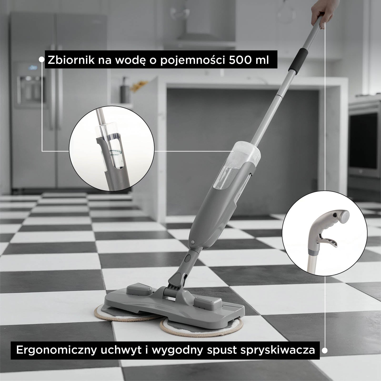 Koniec z moczeniem i wyżymaniem szmat. Ręczny spryskiwacz pozwala nanieść dokładnie tyle płynu, ile potrzebujesz, tam, gdzie jest to potrzebne. Dzięki zbiornikowi na wodę o pojemności 500 ml możesz posprzątać kilka pomieszczeń na jednym napełnieniu, oszczędzając czas i wodę..