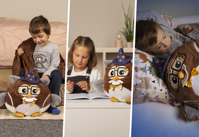 Poznaj sowę „Dzoadka Filipa” z supermocami i rozwesel dzieci. Opracowaliśmy specjalną rodzinę sów, które pomagają dzieciom szybciej zasnąć i uczyć się w przyjemniejszym otoczeniu. Haft na brzuszkach świeci w ciemności, dzięki czemu dziecko w nocy z łatwością odnajdzie zabawkę i ponownie ją do siebie przyciśnie. A dzięki dołączonemu miękkiemu kocykowi ukrytemu wewnątrz sowy, maluchy nigdy nie zmarzną.