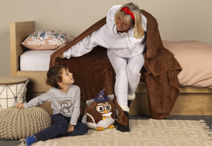 Dzieci i rodzice, na zdrowie! Każdą sówkę można wykorzystać na co najmniej 3 sposoby: jako mięciutką zabawkę, puszystą poduszkę lub ciepły kocyk. Wystarczy otworzyć sowę na brzuszku i wyciągnąć kocyk. Idealny do użytku w domu, w samochodzie czy na wakacjach.