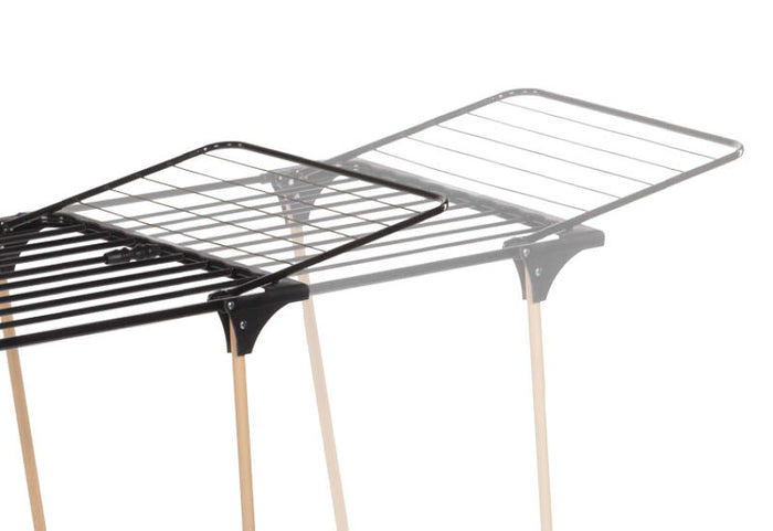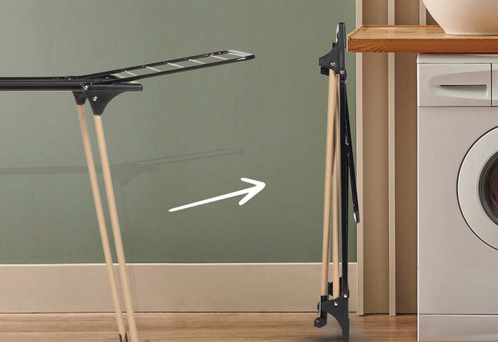 Pranie schnie bardziej naturalnie na wieszaku niż w suszarce bębnowej. Zapobiega to również blaknięciu, rozciąganiu i gnieceniu się ubrań. Stojak składa się do zaledwie 9 cm, dzięki czemu można go łatwo schować za lub pod szafą.