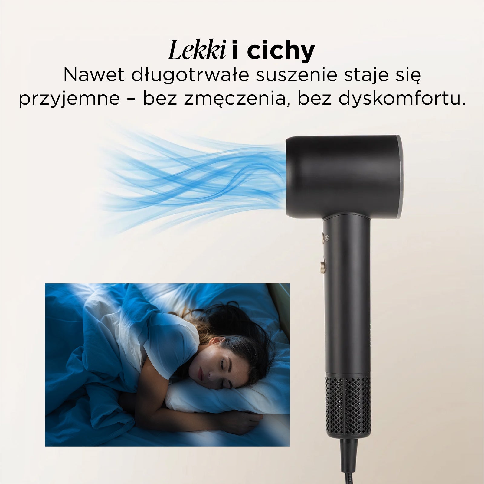 Mocny silnik o prędkości 110 000 obrotów na minutę generuje silny, równomierny strumień powietrza, który suszy włosy znacznie szybciej niż tradycyjne suszarki.
