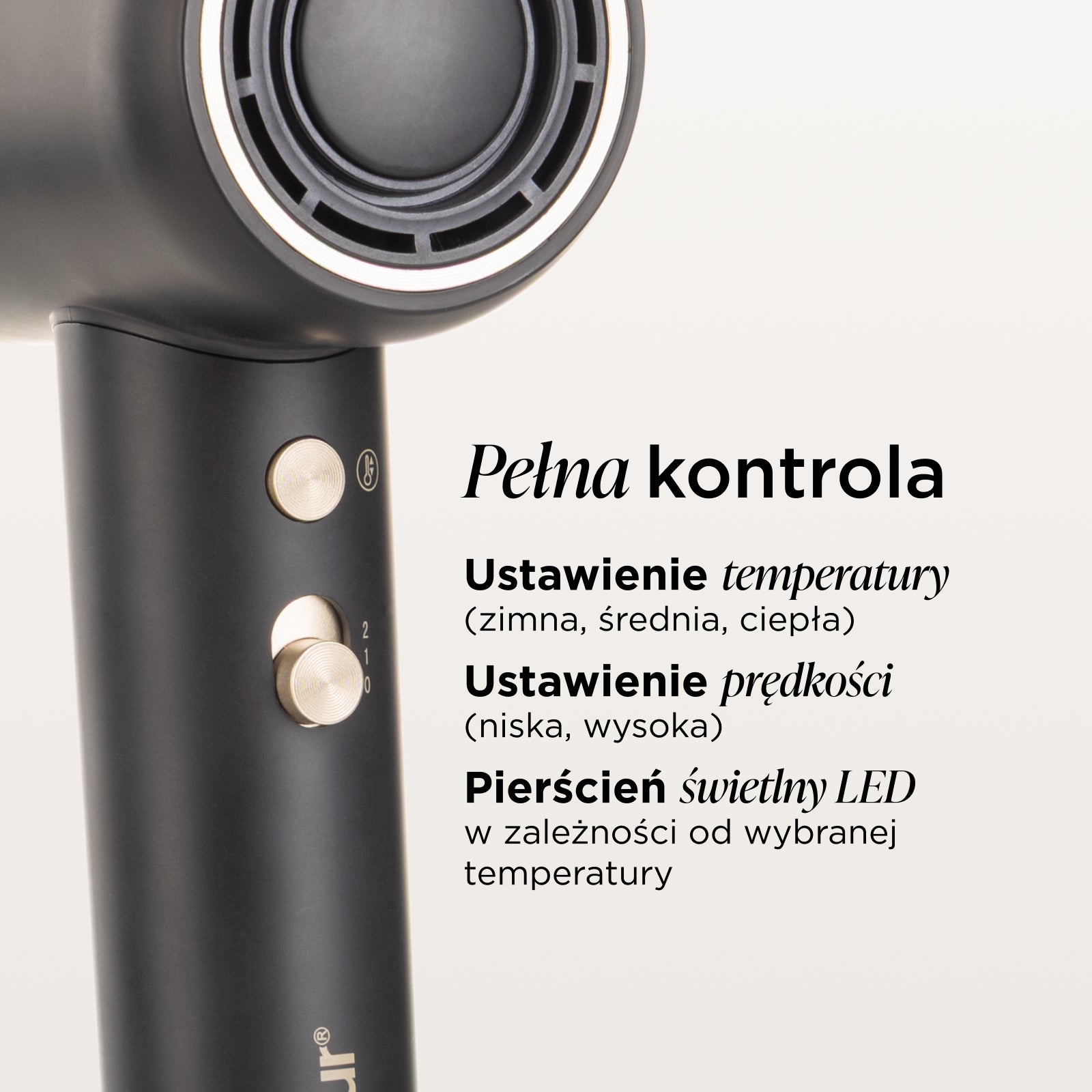 - Mocny i kontrolowany strumień powietrza zamiast wysokiej temperatury – dla ochrony włosów przed uszkodzeniami cieplnymi i zachowania naturalnego blasku