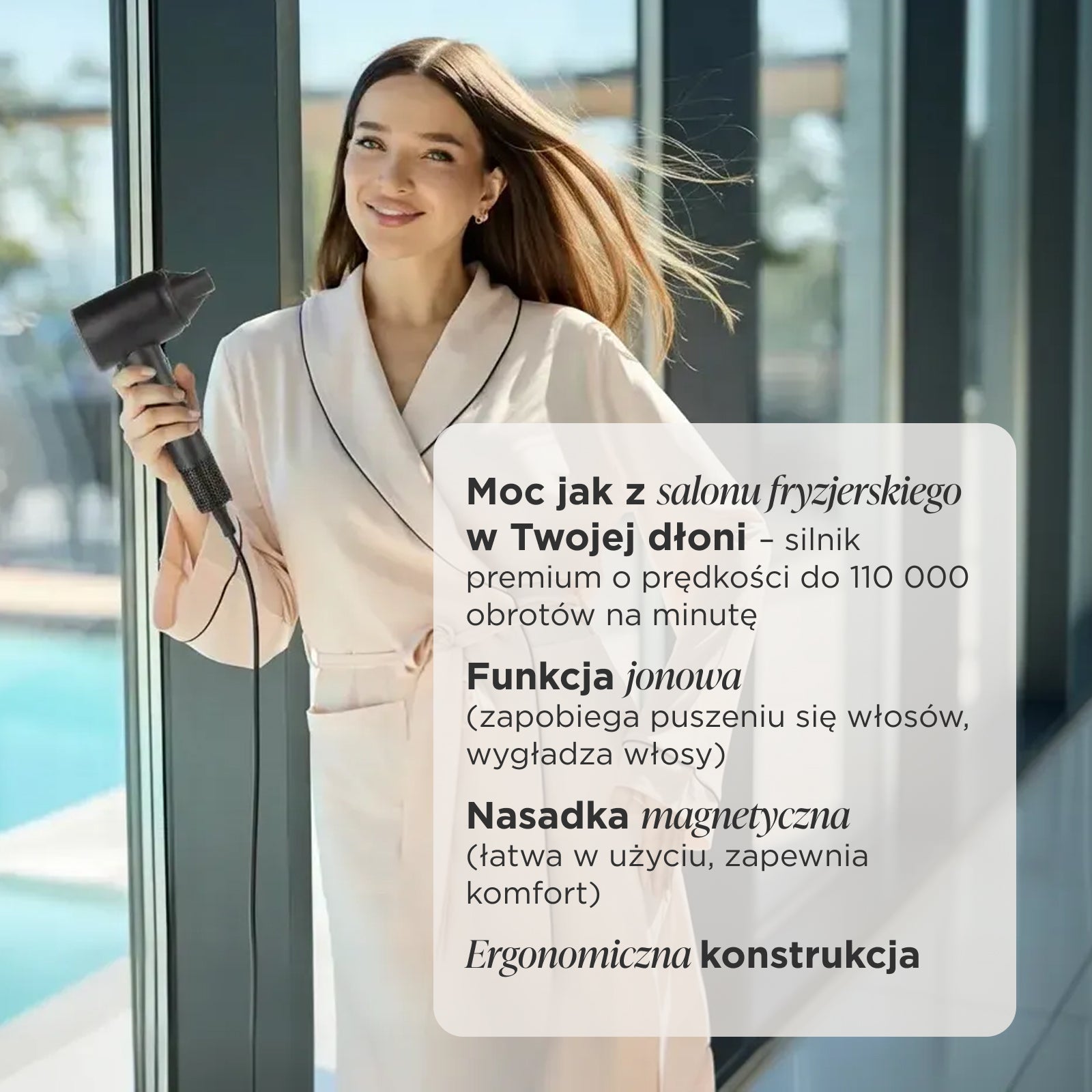 Mocny silnik o prędkości 110 000 obrotów na minutę, wspierany przez jony, redukuje efekt suchych, szorstkich włosów, domyka łuski włosa i zachowuje naturalne nawilżenie.