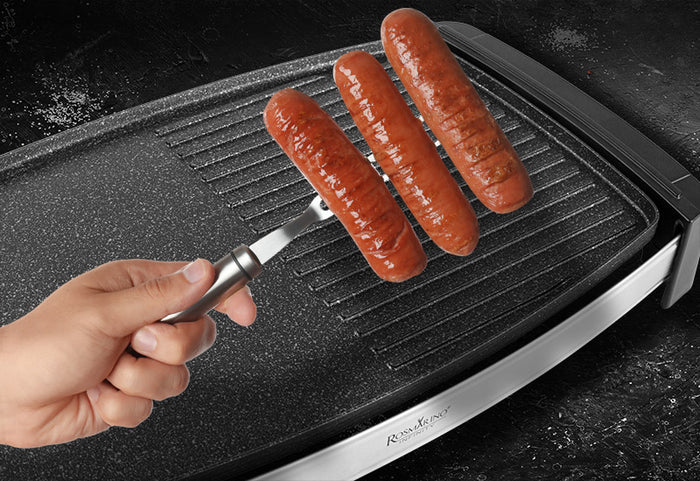 Grilluj w każdą pogodę. Grill elektryczny Rosmarino pozwala na przerzucanie ulubionych potraw z grilla w dowolnym miejscu, nawet na balkonie, podwórku, w kuchni na świeżym powietrzu czy na wakacjach. Płyta grillowa ma gładką i żłobkowaną powierzchnię, dzięki czemu łatwiej wybrać miejsce do przygotowania mięsa, warzyw, jajek, burgerów, ryb czy nawet naleśników. Nieprzywierająca powłoka minimalizuje przywieranie potraw do powierzchni, dlatego grillowanie i czyszczenie będzie dziecinnie proste. Zaskocz swoich gości wszędzie doskonałymi smakami i wyborem dań z grilla.