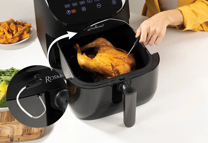 Frytkownica beztłuszczowa Rosmarino TempSense została zaprojektowana, aby pomóc Ci osiągnąć profesjonalne efekty przy minimalnym wysiłku. Jej unikalnym atutem jest innowacyjna, wbudowana sonda temperatury, która zapewnia idealne przygotowanie mięsa do wybranego poziomu wypieczenia. Wystarczy wybrać rodzaj mięsa i ustawić pożądany stopień wypieczenia – sonda zrobi resztę. Pojemność kosza 6 L jest idealna do przygotowania posiłków dla całej rodziny lub przekąsek na wieczorne spotkanie z przyjaciółmi. Możesz wybierać spośród 7 gotowych programów i monitorować proces gotowania przez przezroczyste okienko z wbudowanym oświetleniem. Ta frytkownica to idealny wybór do chrupiących dań z mniejszą ilością tłuszczu, wspierając zdrowy styl życia.