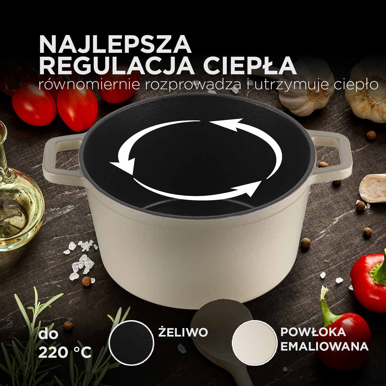 Garnek doskonale zatrzymuje ciepło i równomiernie rozprowadza je po całej powierzchni. 3-warstwowa powłoka emaliowana sprawia, że żywność nie przywiera do dna garnka.