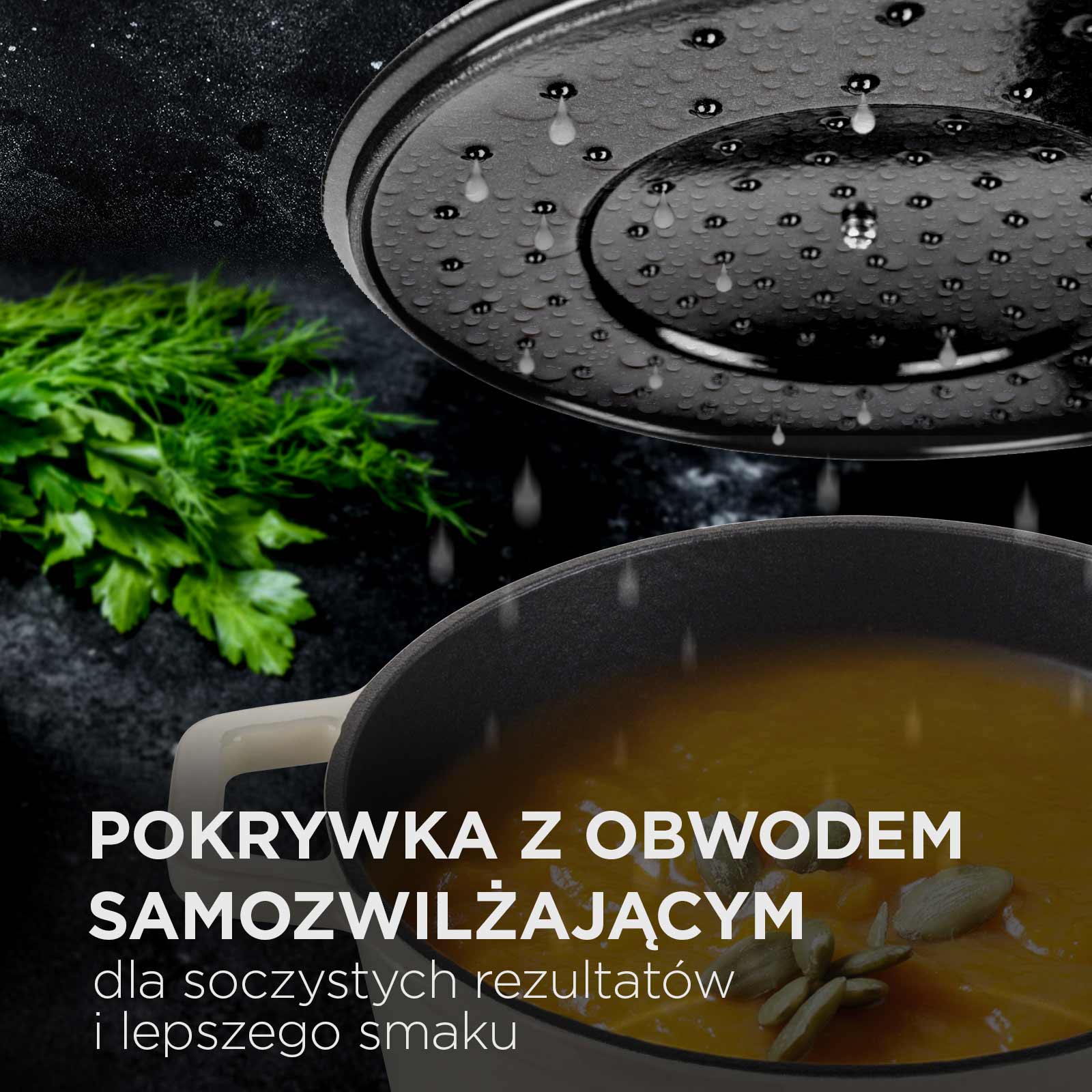 - Specjalnie ukształtowana pokrywka kondensuje parę, dzięki czemu smak i składniki odżywcze pozostają w żywności.