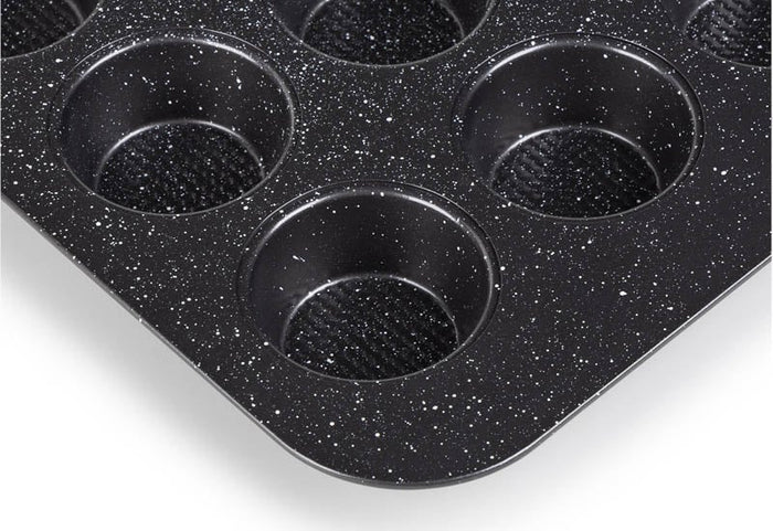 Forma do muffinów Rosmarino BakerPRO to wszystko, czego potrzebujesz, aby idealnie przygotować soczyste i smaczne muffinki owocowe, czekoladowe lub warzywne. Patelnia o wyglądzie marmuru posiada szwajcarską jakość nieprzywierającą powłokę ILAG, która zapewnia równomierne rozprowadzanie ciepła i pieczenie z minimalną ilością tłuszczu, ponieważ żywność nie przykleja się do patelni. Dzięki konstrukcji ze stali węglowej patelnia jest odporna na wysokie temperatury do 230°C i nadaje się do przechowywania w lodówce i zamrażarce. Trwała i niezawodna konstrukcja zapewniająca profesjonalne rezultaty pieczenia.