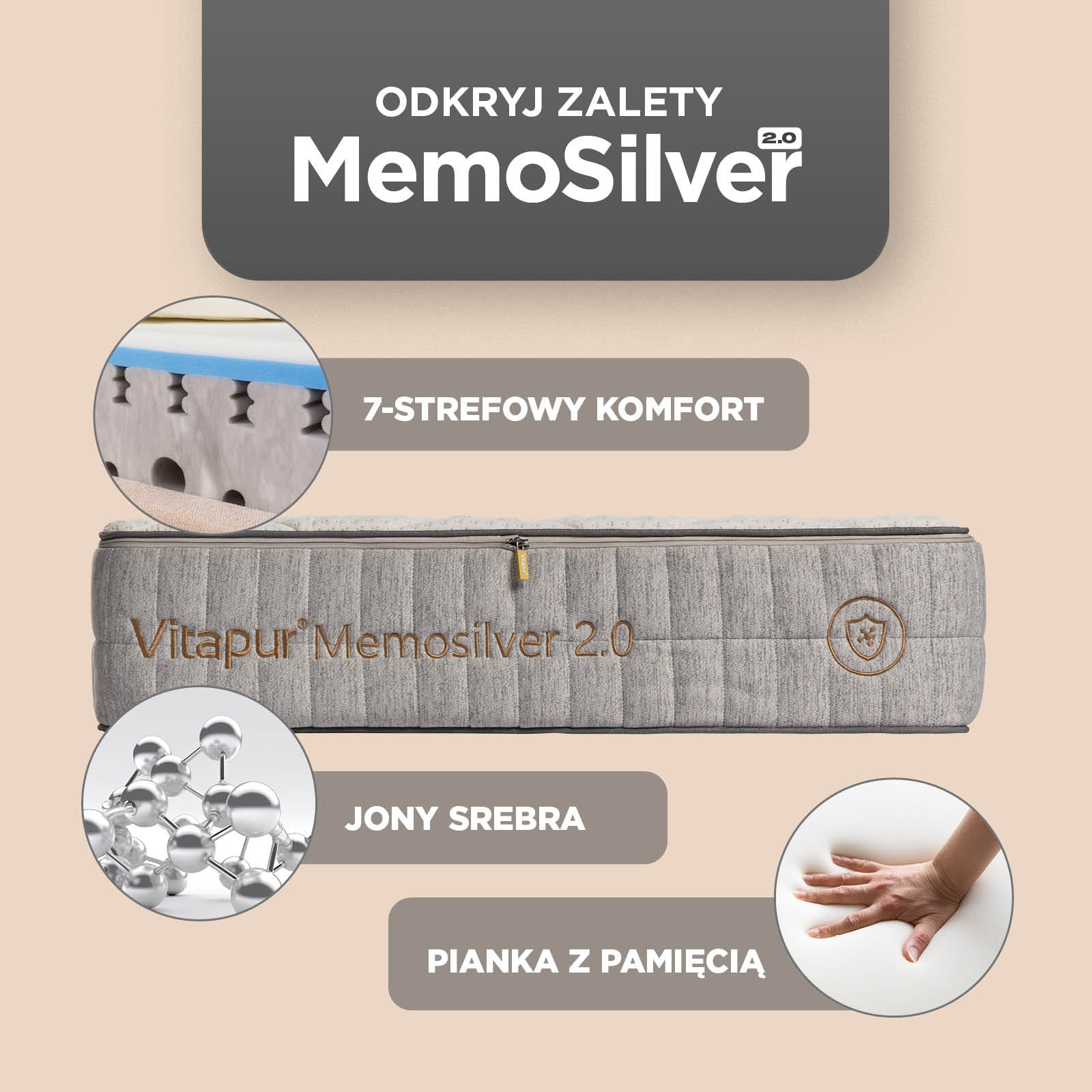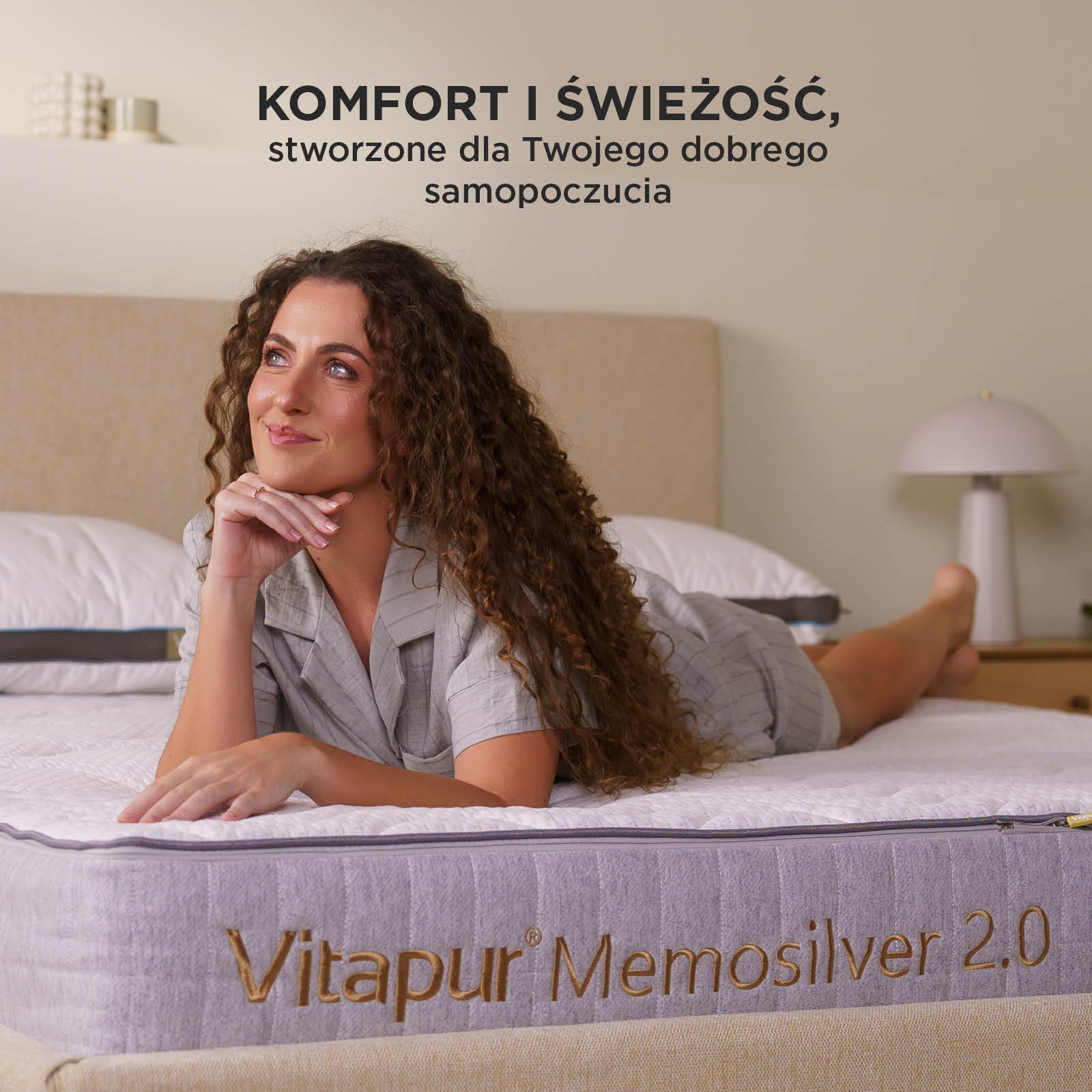 Odkryj luksus lepszego snu z nowym i udoskonalonym materacem piankowym Vitapur MemoSilver 2.0. Wykonany z starannie dobranych materiałów, jest szczególnie odpowiedni dla osób z alergiami i wrażliwą skórą. Aby zapewnić czystsze i zdrowsze środowisko snu, pokrowiec materaca zawiera jony srebra, które dzięki swoim właściwościom antybakteryjnym aktywnie zapobiegają gromadzeniu się bakterii, roztoczy i alergenów w materacu. Tymczasem oddychająca pianka w rdzeniu zapewnia optymalną cyrkulację powietrza i odprowadza nadmiar ciepła. Zmniejsza to pocenie się i utrzymuje materac suchym, bardziej higienicznym i mniej podatnym na alergeny. Pianka wspierająca z 7 strefami zapewnia komfort we wszystkich pozycjach snu, oferując optymalne podparcie we wszystkich punktach nacisku. Dla pełnego relaksu i miękkiego odczucia przy każdym kontakcie, pokrowiec zawiera piankę memory, która otula ciało i dostosowuje się do każdego ruchu.