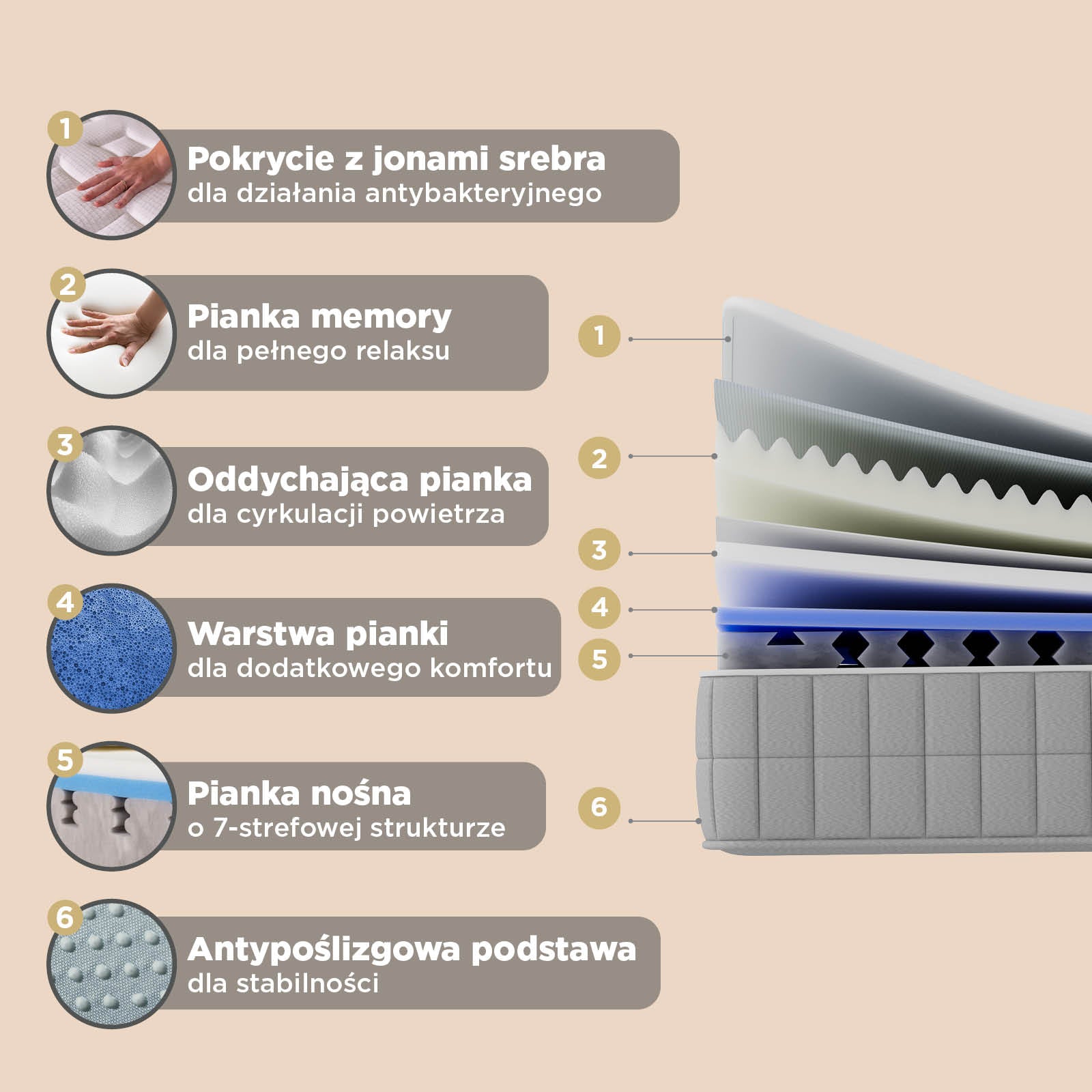 • Pianka memory wszyta w pokrowiec delikatnie otula ciało i zapewnia komfort we wszystkich pozycjach snu.