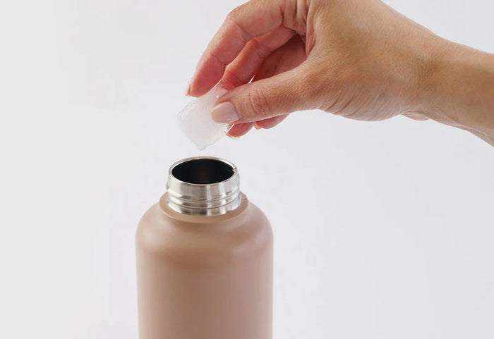 Butelka ma zakrętkę z silikonową uszczelką, która nie przecieka, dzięki czemu można ją wrzucić do torby pod dowolnym kątem bez obawy o rozlanie czegokolwiek.