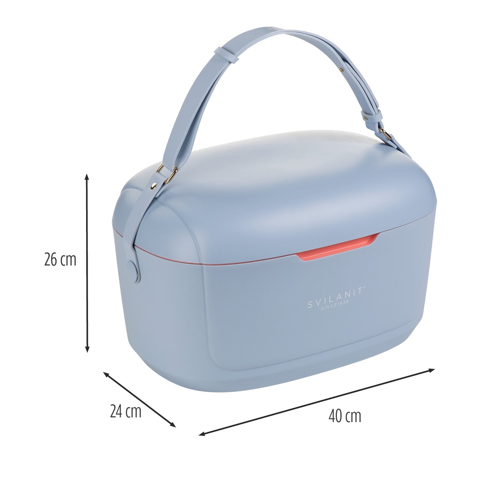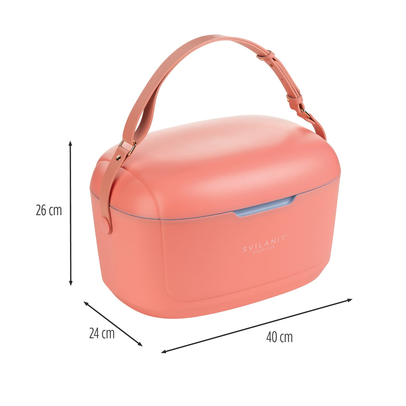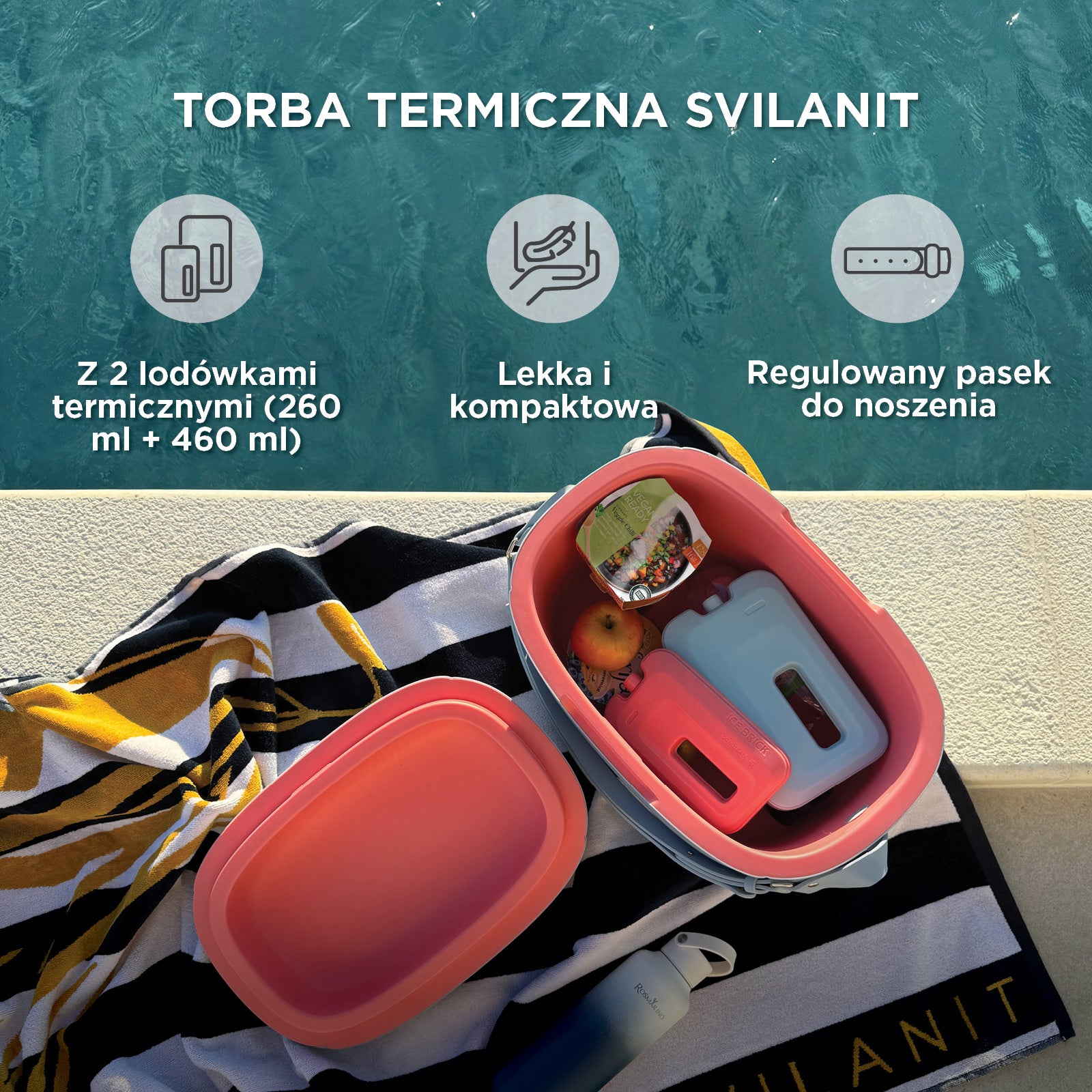 Zapomnij o miękkich torbach chłodzących, które łatwo się przewracają i nieatrakcyjnych chłodziarkach, które chowasz pod ręcznikiem! Elegancka i wytrzymała chłodziarka Svilanit jest Twoim niezastąpionym towarzyszem w ciepłe dni. Niezależnie od tego, czy wybierasz się na rodzinny piknik, romantyczną wycieczkę nad morze, czy po prostu potrzebujesz niezawodnego codziennego chłodzenia, ta praktyczna chłodziarka zapewnia, że ​​Twoje napoje pozostaną lodowate, a jedzenie świeże przez wiele godzin. Dwa dołączone wkłady chłodzące zapewniają jeszcze dłuższe i intensywniejsze chłodzenie. Dostępna w 2 rozmiarach i 2 pięknych letnich kolorach chłodziarka będzie czymś, czym będziesz się z dumą chwalić, a jej noszenie jest łatwe dzięki regulowanemu i wygodnemu paskowi na ramię.
