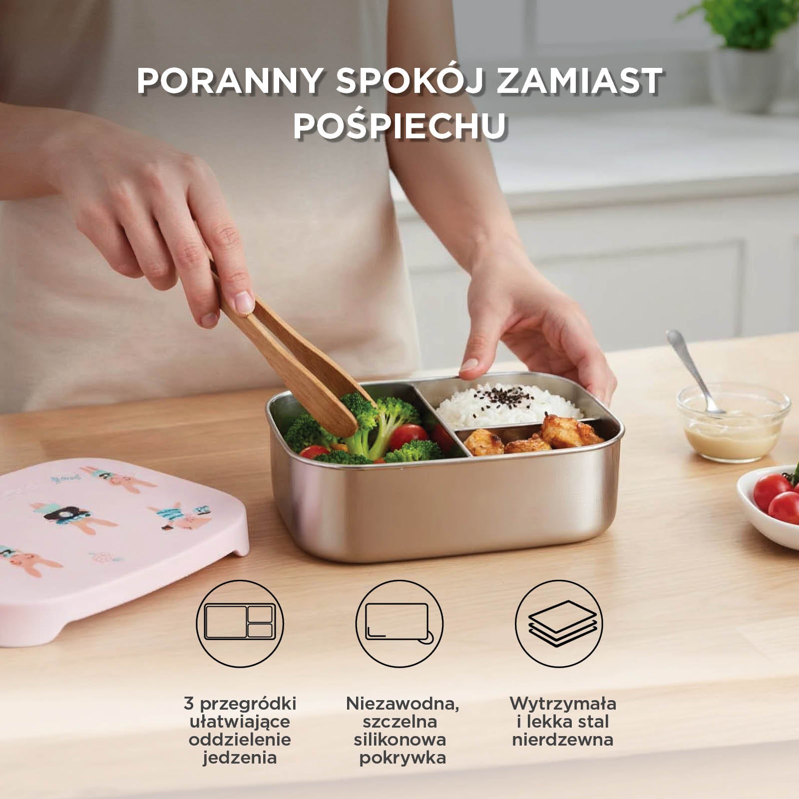 - Poranny spokój zamiast pośpiechu – 3 przegródki oddzielają owoce, przekąski i główny posiłek.