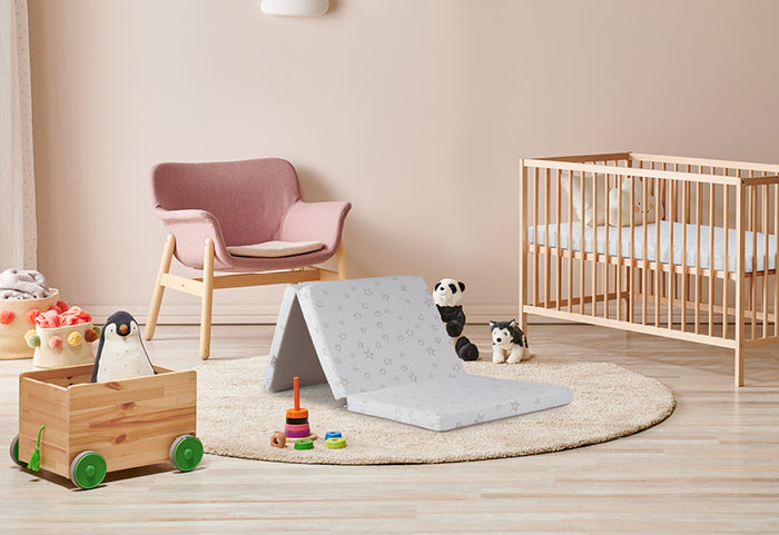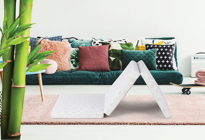 Bamboo Flex to trzyczęściowy, składany materac odpowiedni w podróży lub wszędzie tam, gdzie potrzebujesz dodatkowego łóżka dla swojego dziecka. Może być również używany w łóżeczku lub jako mata do zabawy.
