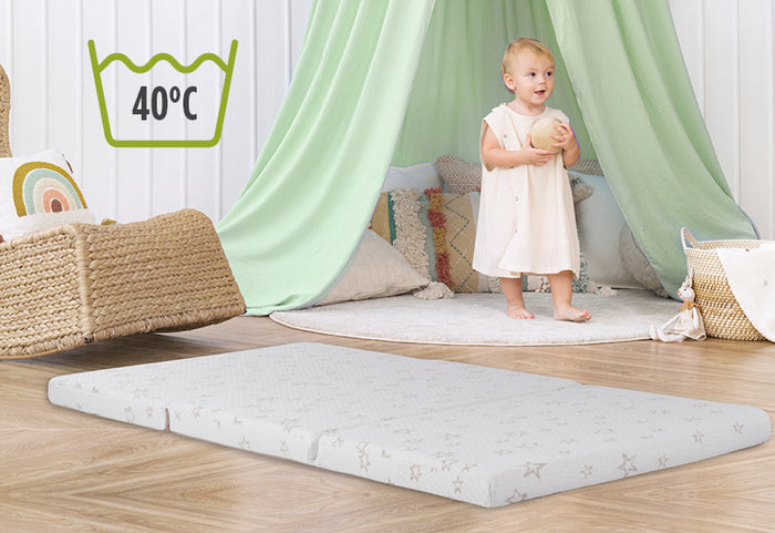 Składany materac dziecięcy Bamboo Flex ma wysokość 5 cm i zapewnia doskonałe podparcie dla ciała dziecka oraz prawidłową pozycję kręgosłupa. Rdzeń wykonany jest z pianki poliuretanowej, która podąża za rozwojem dziecka i dopasowuje się do ciała, oferując wsparcie i zapewniając spokojny sen. Materac jest łatwo składany na trzy części i może być używany w łóżeczku jako mata do zabawy lub jako dodatkowy materac podczas podróży lub biwaku. Tkanina pokrowca zawiera naturalne włókna bambusowe, które tworzą suche i świeże środowisko do spania. Pokrowiec na materac jest zdejmowany i można go prać w temperaturze 40°C.