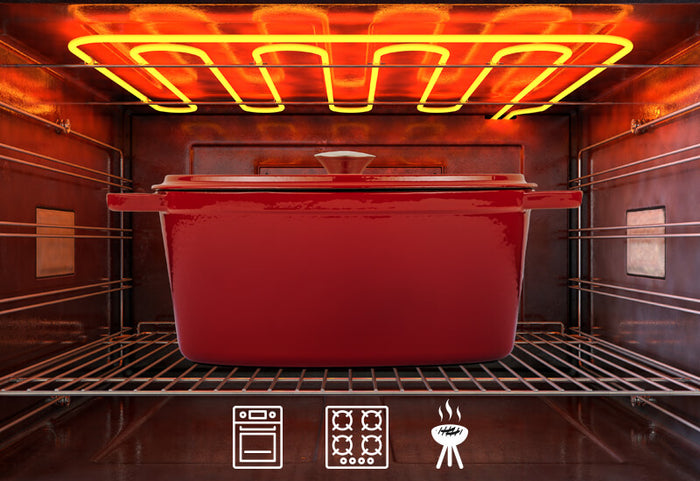 Naczynia można używać na wszystkich rodzajach płyt grzewczych. Ponieważ jest odporne na temperatury do 190°C, może być również używane w piekarniku i na grillu. W przeciwieństwie do innych naczyń, gotowanie w naczyniach żeliwnych wymaga znacznie niższej temperatury, aby uzyskać doskonałe rezultaty. Nie trzeba go przegrzewać, aby uzyskać maksymalną wydajność.