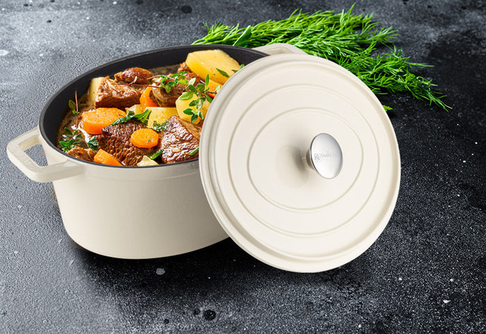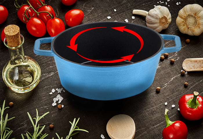 Garnek doskonale zatrzymuje ciepło i równomiernie rozprowadza je po całej powierzchni. 3-warstwowa powłoka emaliowana sprawia, że żywność nie przywiera do dna garnka.