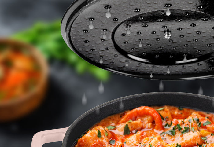 Pokrywka doskonale skrapla parę dzięki niewielkim wypustkom. Garnek gotuje lub piecze jedzenie równomiernie, we własnych sokach, zachowując w ten sposób więcej witamin i minerałów oraz pełniejszy smak.
