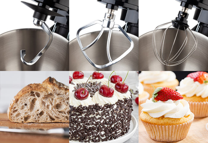 Użyj trzepaczki do ubijania śmietany, białek jaj lub przygotowania różnych dressingów. Za pomocą haka do ciasta zagnieć ciasto na pizzę, chleb i inne wypieki, a płaską ubijaczkę wykorzystaj do naleśników, ciastek i innych wypieków.