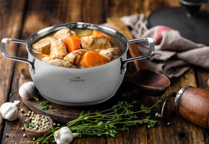 Najwyższej jakości naczynia ze stali nierdzewnej 18/10 z 3-warstwowym dnem uderzeniowym dla szybkiego nagrzewania i równomiernego gotowania. Gruba warstwa najwyższej jakości niemieckiej stali nierdzewnej, aluminiowy rdzeń dla dobrego przewodzenia ciepła i zewnętrzna stal nierdzewna zapewniają trwałość, odporność i wydajne gotowanie. Technologia ThermoFlow zapewnia równomierne rozprowadzanie ciepła na całej powierzchni naczynia, dzięki czemu stalowa rama naczynia odpowiednio się nagrzewa i umożliwia szybkie i niezwykle wydajne gotowanie.