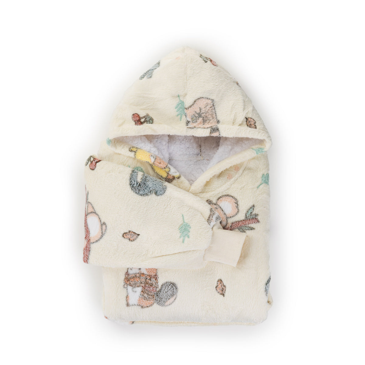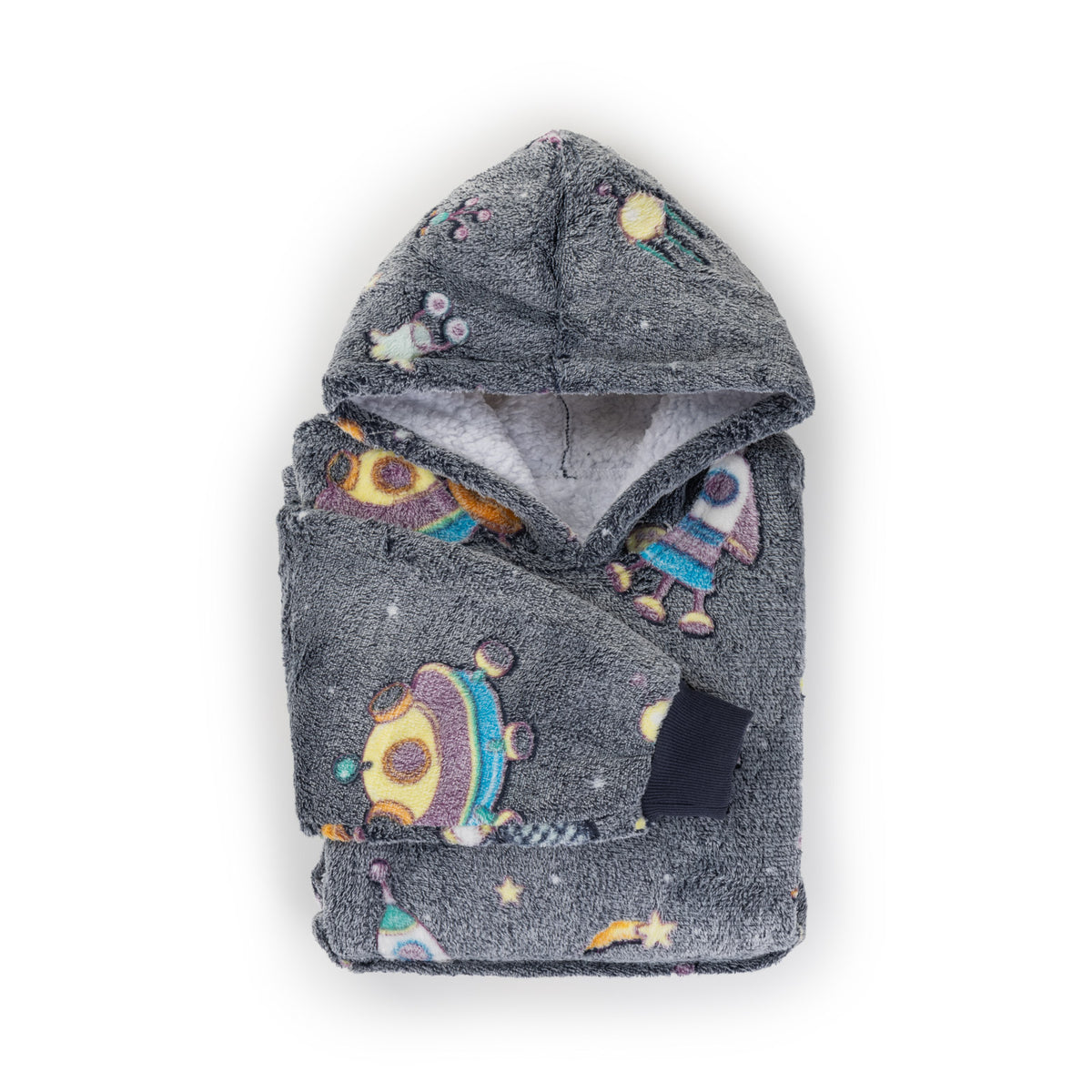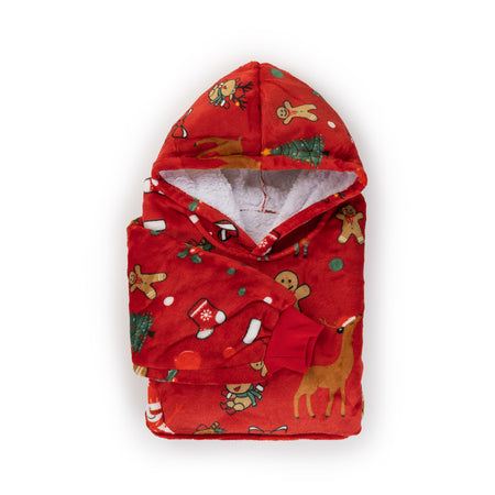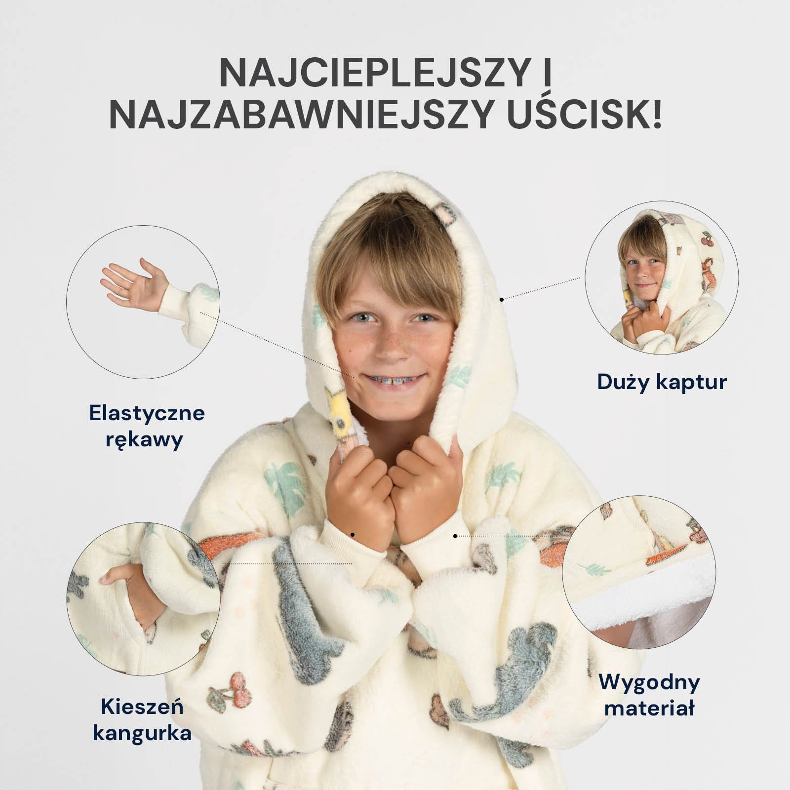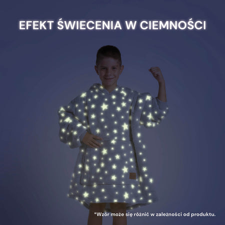 - Popularny kocyk z kapturem i rękawami, który zapewni dzieciom przytulność i ciepło.