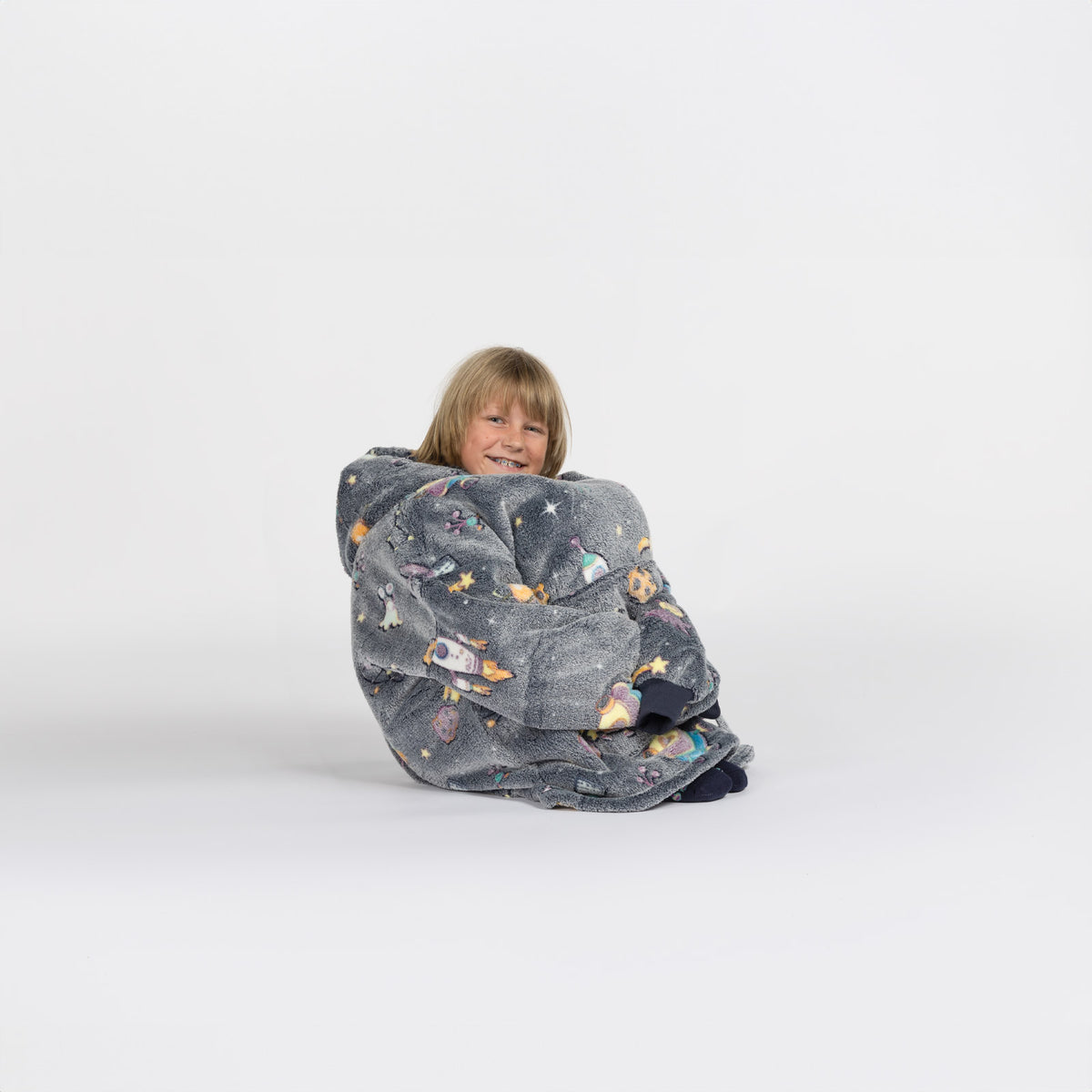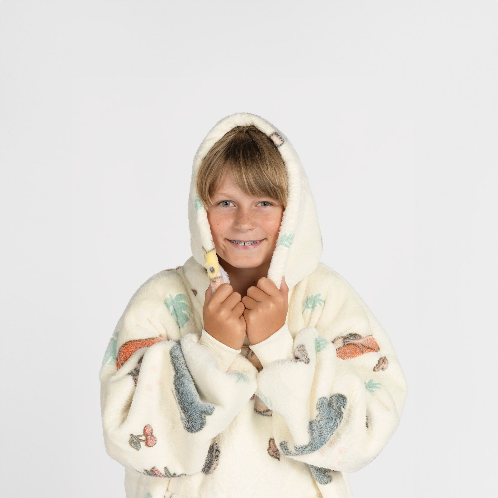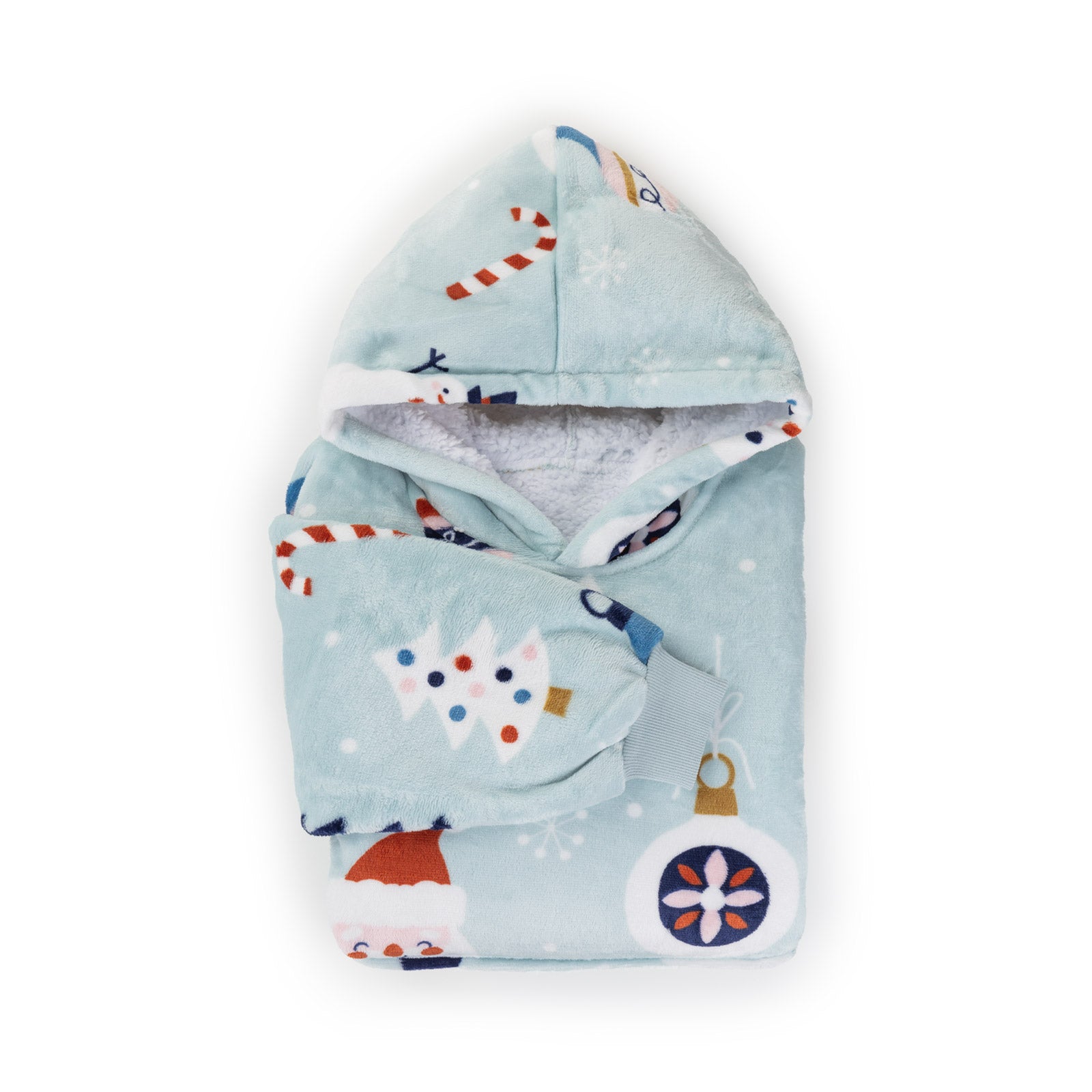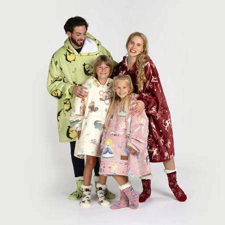 - Popularny kocyk z kapturem i rękawami, który zapewni dzieciom przytulność i ciepło.