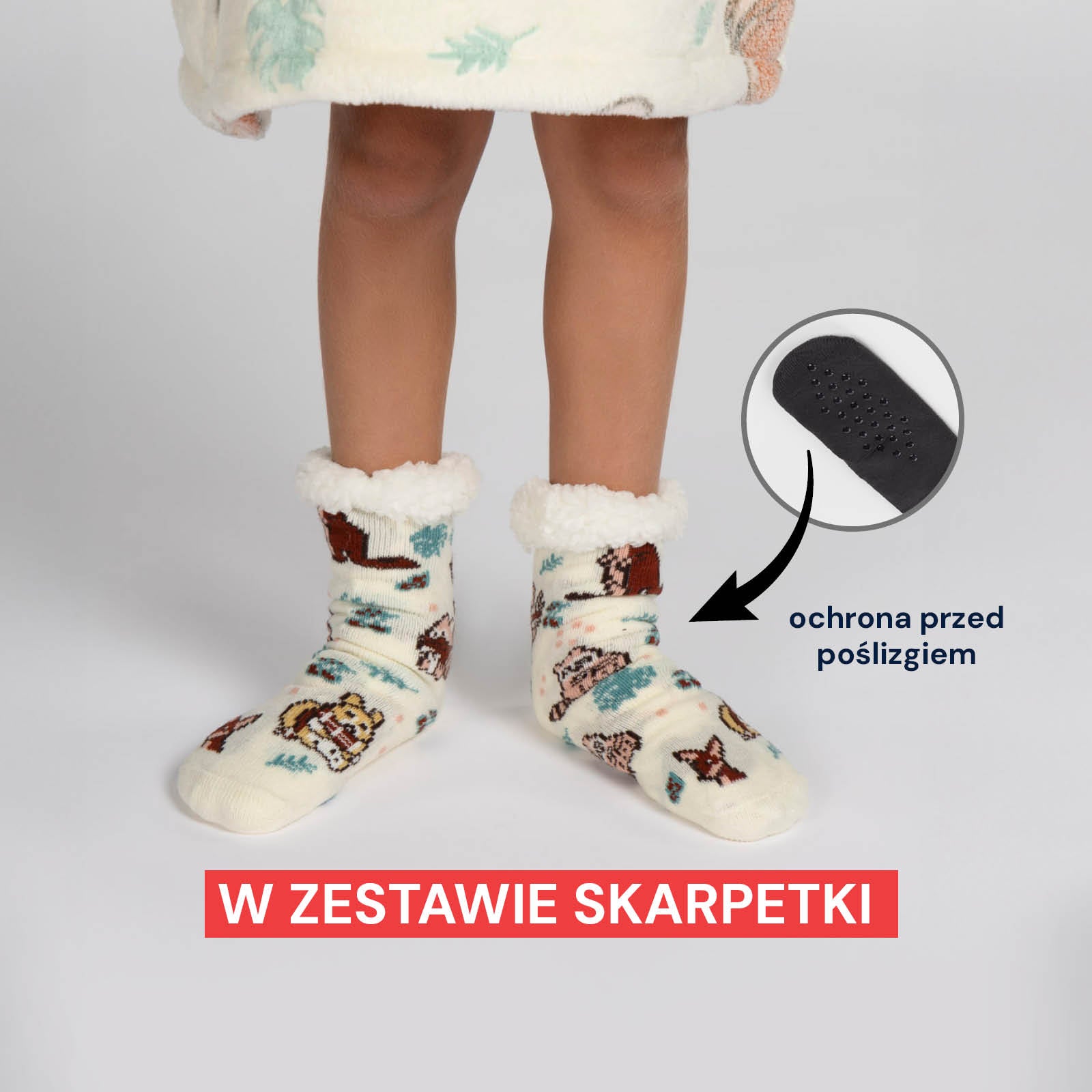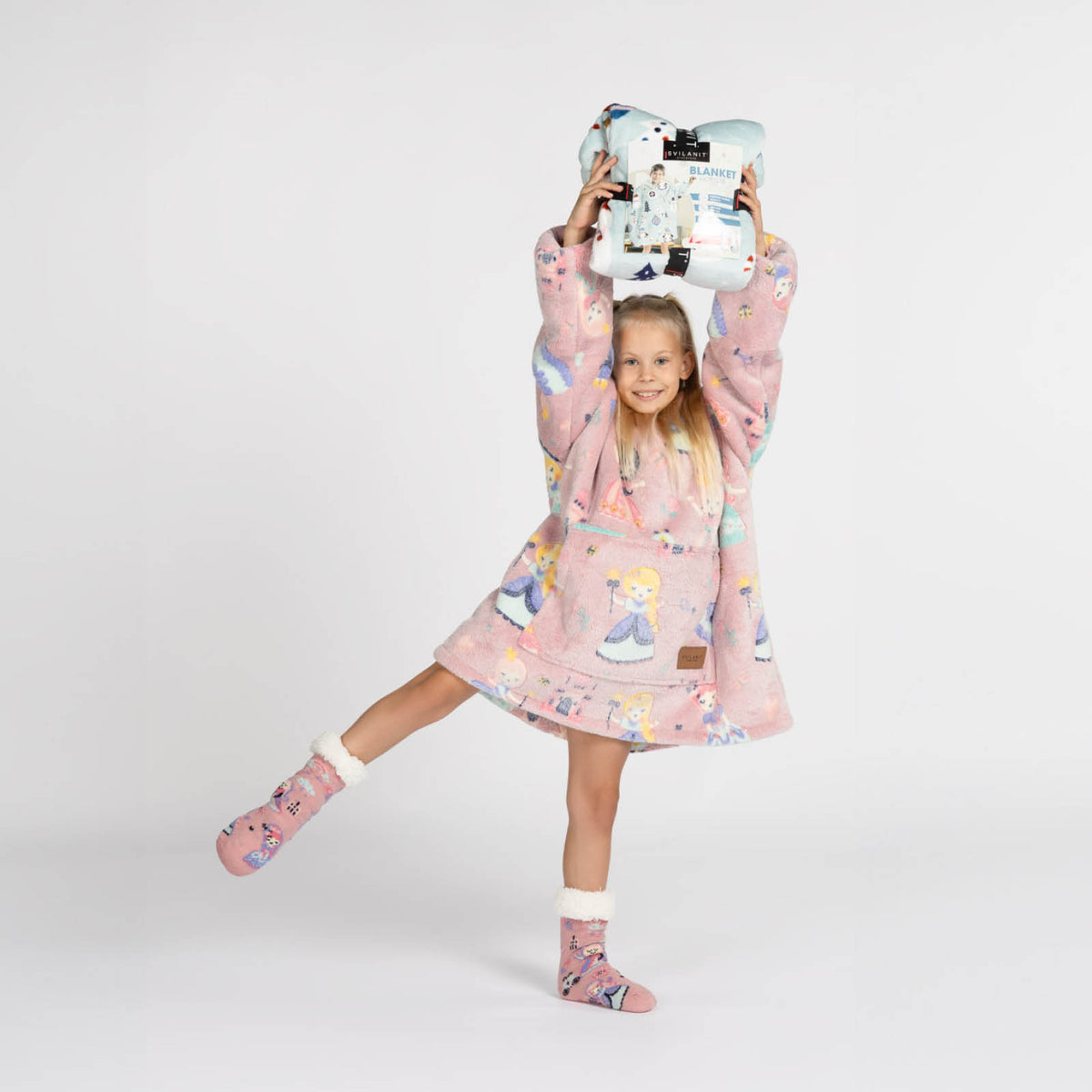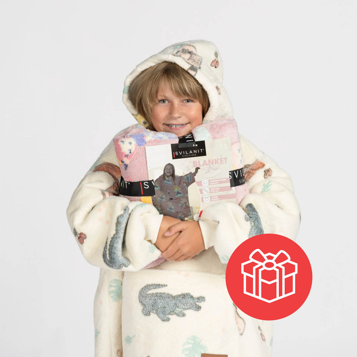 Dziecięcy kocyk z kapturem Svilanit to popularny, ciepły, dłuższy sweter, który odmieni życie dzieci, zapewniając im ciepło na zawsze. Idealny do rozkoszowania się w chłodniejsze wieczory lub poranki, kiedy potrzeba czegoś miękkiego i ciepłego. Wykonany z dwustronnego materiału, który doskonale zatrzymuje ciepło. Dodatkowy kaptur i duża kieszeń kangurka zapewniają jeszcze większy komfort noszenia. W prezencie dodaliśmy także miękkie skarpetki termiczne, które świetnie zatrzymują ciepło.