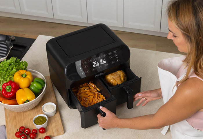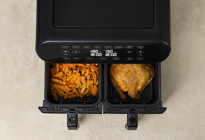 Chcesz przygotować pyszny obiad bez dodatkowych garnków i włączania piekarnika? I bez tego denerwującego zapachu smażenia? Zapomnij o piekarniku i starych metodach smażenia, a zaoszczędzisz czas i energię. Frytkownica na gorące powietrze Rosmarino Infinity PRO XXL pomoże Ci uzyskać szybsze i zdrowsze posiłki. Smażenie gorącym powietrzem zachowuje składniki odżywcze w Twoich potrawach. Piecz chrupiące frytki, skrzydełka, paluszki rybne lub desery z 85% mniejszą ilością tłuszczu. 8 dostępnych funkcji, w tym odwadnianie owoców i warzyw. Przygotuj obiad w 2 oddzielnych koszach, ustawiając temperaturę i czas gotowania dla każdego dania.