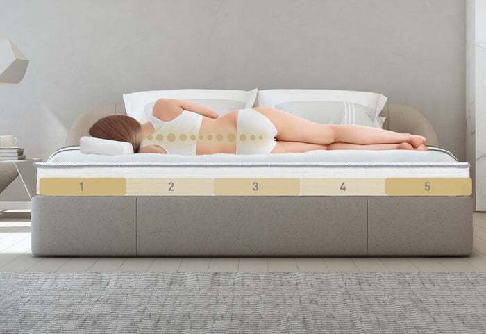 - Materac 5-strefowy składa się z 5 różnych twardości, aby zapewnić odpowiednie wsparcie dla każdej części Twojego ciała. Twoje kręgi będą wyrównane, a mięśnie całkowicie rozluźnione w każdej pozycji snu.