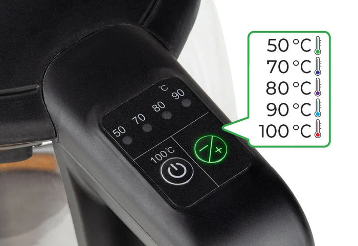 Na czajniku można precyzyjnie ustawić żądaną temperaturę. Wielokolorowe podświetlenie LED pokazuje 5 poziomów temperatury: 50 °C, 70 °C, 80 °C, 90 °C, 100 °C, spośród których można wybierać. Nigdy więcej niepewności, czy woda na ulubioną zieloną, czarną lub ziołową herbatę osiągnęła idealną temperaturę.