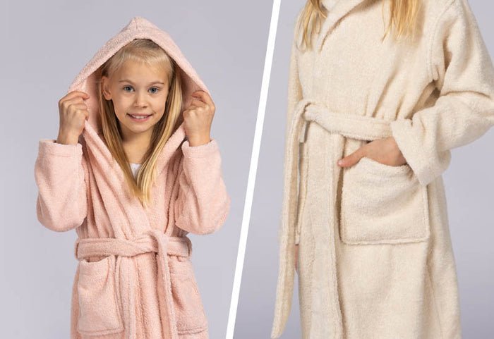 Po wieczornej kąpieli lub godzinach spędzonych na basenie dzieci z radością otulą się tym szlafrokiem, który jest tak miękki i przytulny jak matczyny uścisk. Naturalny, oddychający materiał zapewnia dziecku wygodę, jednocześnie będąc delikatnym dla wrażliwej skóry. Dzięki gęstemu splotowi i gramaturze 380 g/m² materiał jest bardzo chłonny, ale lekki i szybko schnie.