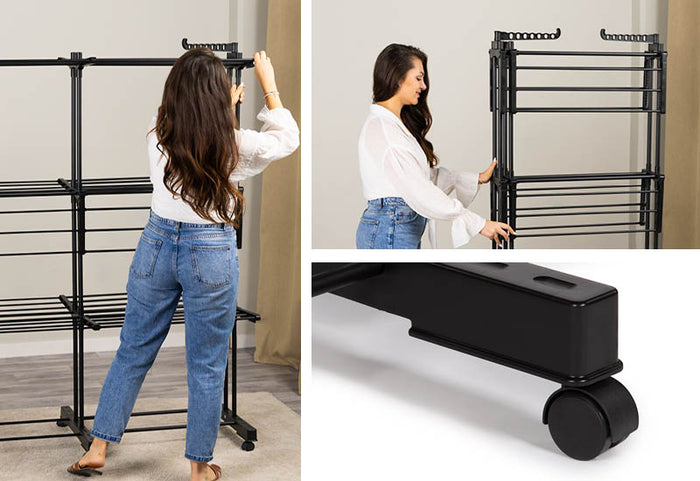 Możesz rozłożyć, rozszerzyć i złożyć suszarkę w zaledwie 15 sekund, a dzięki 6 niezawodnym kółkom szybko przemieścisz ją tam, gdzie chcesz. Pomimo pionowej konstrukcji suszarka jest wystarczająco stabilna i wytrzymała, aby używać jej bez obaw o przewrócenie.