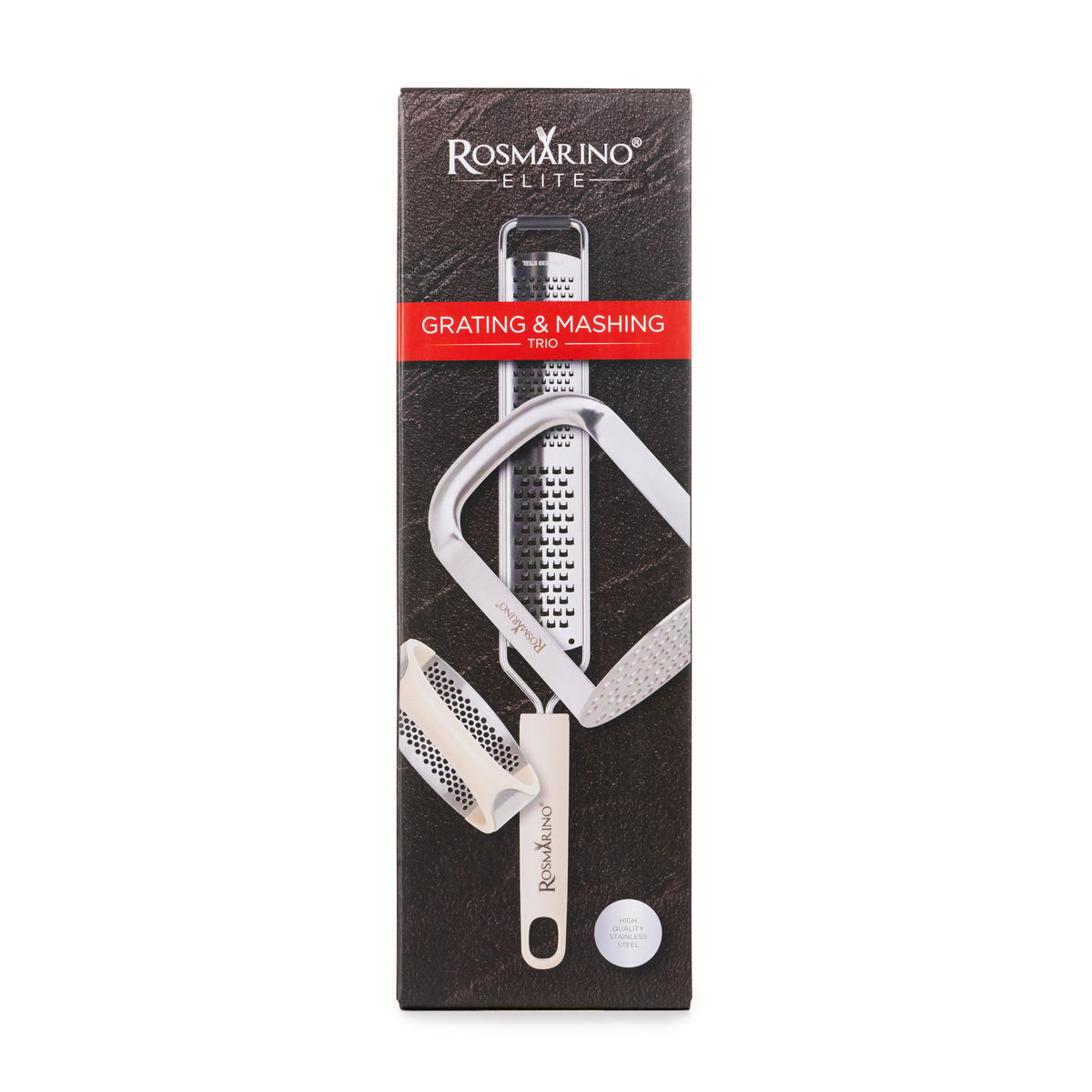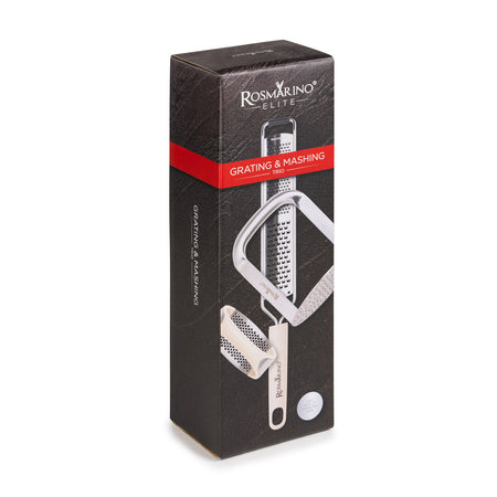 3-częściowy zestaw kuchennych przyborów Rosmarino Elite do tarcia i ugniatania to idealne uzupełnienie każdej kuchni, ponieważ zawiera narzędzia do codziennych zadań kulinarnych. Zestaw obejmuje tarkę do sera, praktyczną praskę do czosnku oraz tłuczek do ziemniaków do gładkiego, kremowego puree ziemniaczanego. Wszystkie przybory wykonano z wysokiej jakości stali nierdzewnej z wygodnymi uchwytami, które zapewniają bezpieczny i ergonomiczny chwyt dla łatwego użytkowania. Dzięki temu zestawowi przygotowywanie posiłków staje się wydajne, szybkie i przyjemne, a wszystkie elementy można łatwo myć w zmywarce.