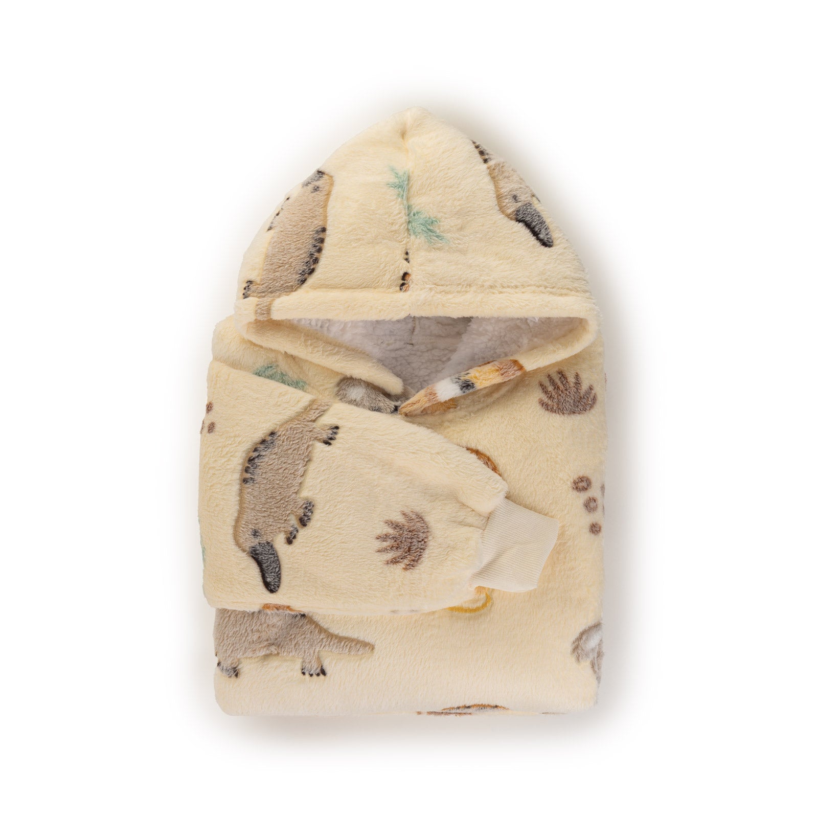 Miękka, puszysta tkanina przypomina ulubioną pluszową zabawkę dziecka, dlatego chętnie będzie nosić ten koc z kapturem. To coś więcej niż koc – to ciepły uścisk i schronienie, które dzieci kojarzą z komfortem, bezpieczeństwem i domowym ciepłem.