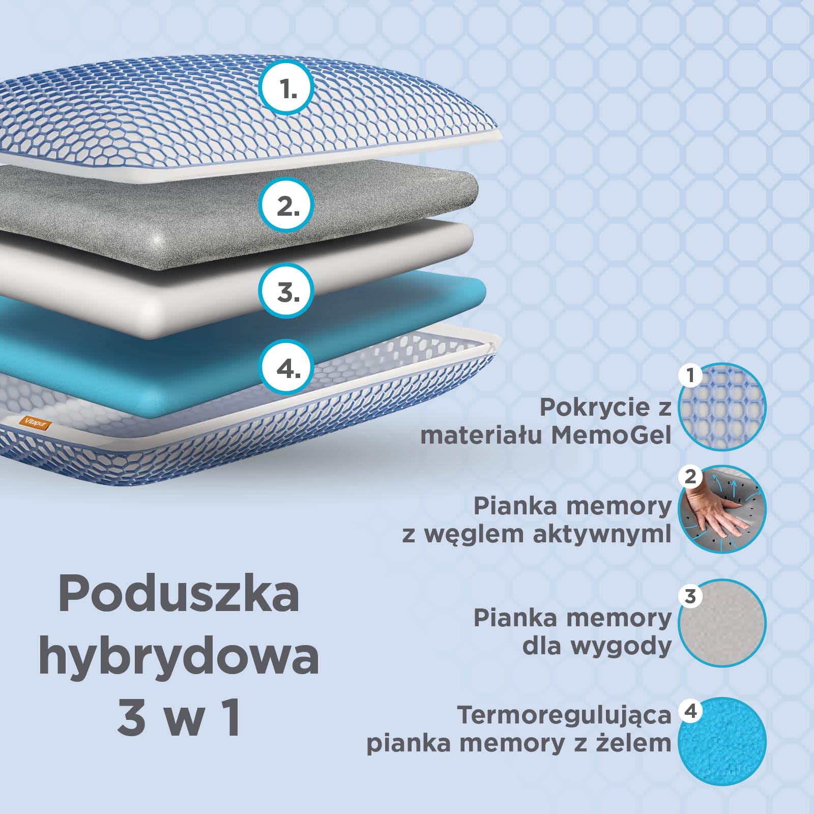 - Hybrydowa poduszka 3 w 1 z trzema wysokiej jakości piankami memory dla dostosowanego komfortu.