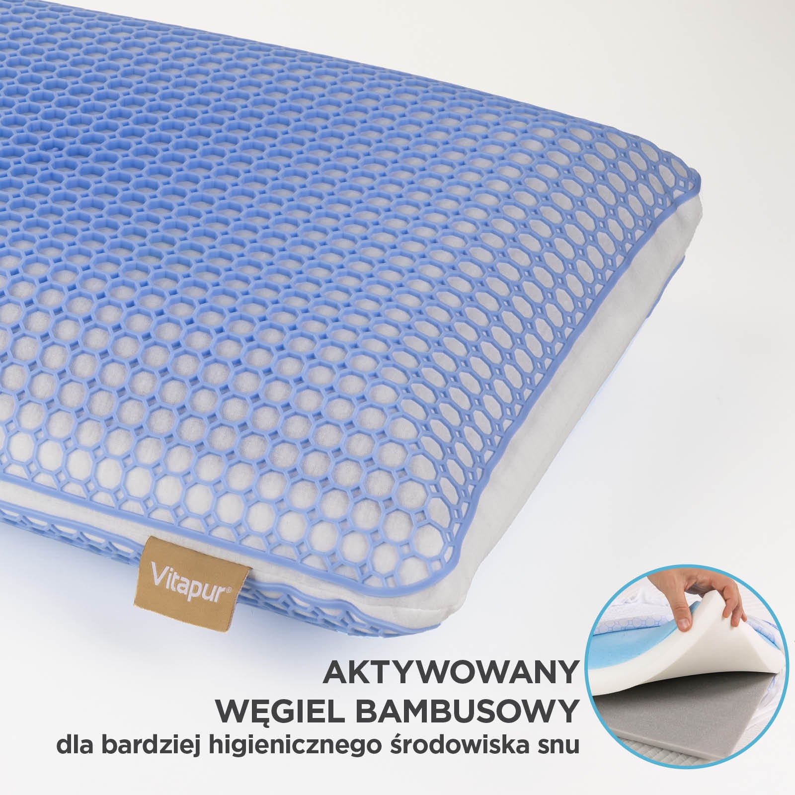 - Pianka memory z aktywnym węglem dopasowuje się do pozycji głowy, odprowadza nadmiar ciepła i zapobiega gromadzeniu się roztoczy.