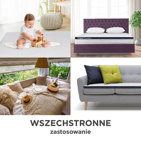 Hybrydowy topper na materac Vitapur MemoElite o wysokości 8 cm to idealne rozwiązanie, aby poprawić komfort starego materaca, sofy lub zapewnić wygodne spanie podczas podróży czy biwakowania. Innowacyjny materiał MemoGel natychmiast reaguje na ruchy ciała i zapewnia do 25% lepsze podparcie niż tradycyjna pianka z pamięcią. Dzięki swojej siatkowej strukturze skutecznie odprowadza nadmiar ciepła z ciała, oferując do 50% lepszą oddychalność. Świeże i suche środowisko snu wspiera również żel zawarty w piance ViscoCell, który pochłania ciepło i reguluje temperaturę, zapobiegając poceniu się podczas snu. Pianka z pamięcią zapewnia indywidualne podparcie w każdej pozycji, redukuje nacisk i utrzymuje kręgosłup w optymalnej pozycji, zapewniając bezbolesny sen. Topper zawiera również węgiel bambusowy, który ma właściwości antybakteryjne, pomagając utrzymać powierzchnię do spania w czystości i higienie. Dla komfortowego, świeżego i zdrowego snu topper MemoElite to właściwy wybór!