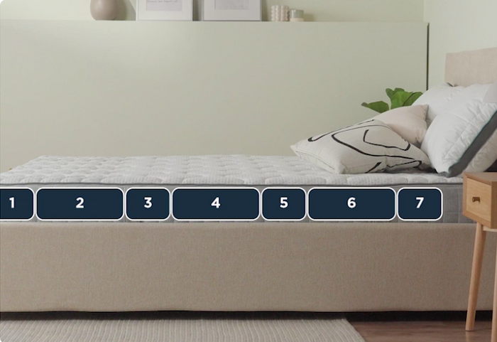 Pianka wspierająca podzielona jest na 7 stref, które zostały optymalnie zaprojektowane, aby równomiernie rozłożyć ciężar ciała, wspierać wszystkie punkty kontaktu z materacem i utrzymywać kręgosłup w prawidłowej pozycji podczas snu. Dodaliśmy również cieńszą warstwę pianki, która jest wystarczająco twarda, aby zapobiegać uczuciu zapadania się podczas leżenia.