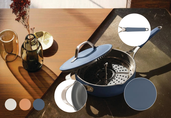 Nowoczesna paleta kolorów i czyste linie pozwalają serwować potrawy bezpośrednio na patelni. Mniej naczyń, mniej zmywania i lepsza prezentacja gotowych dań.