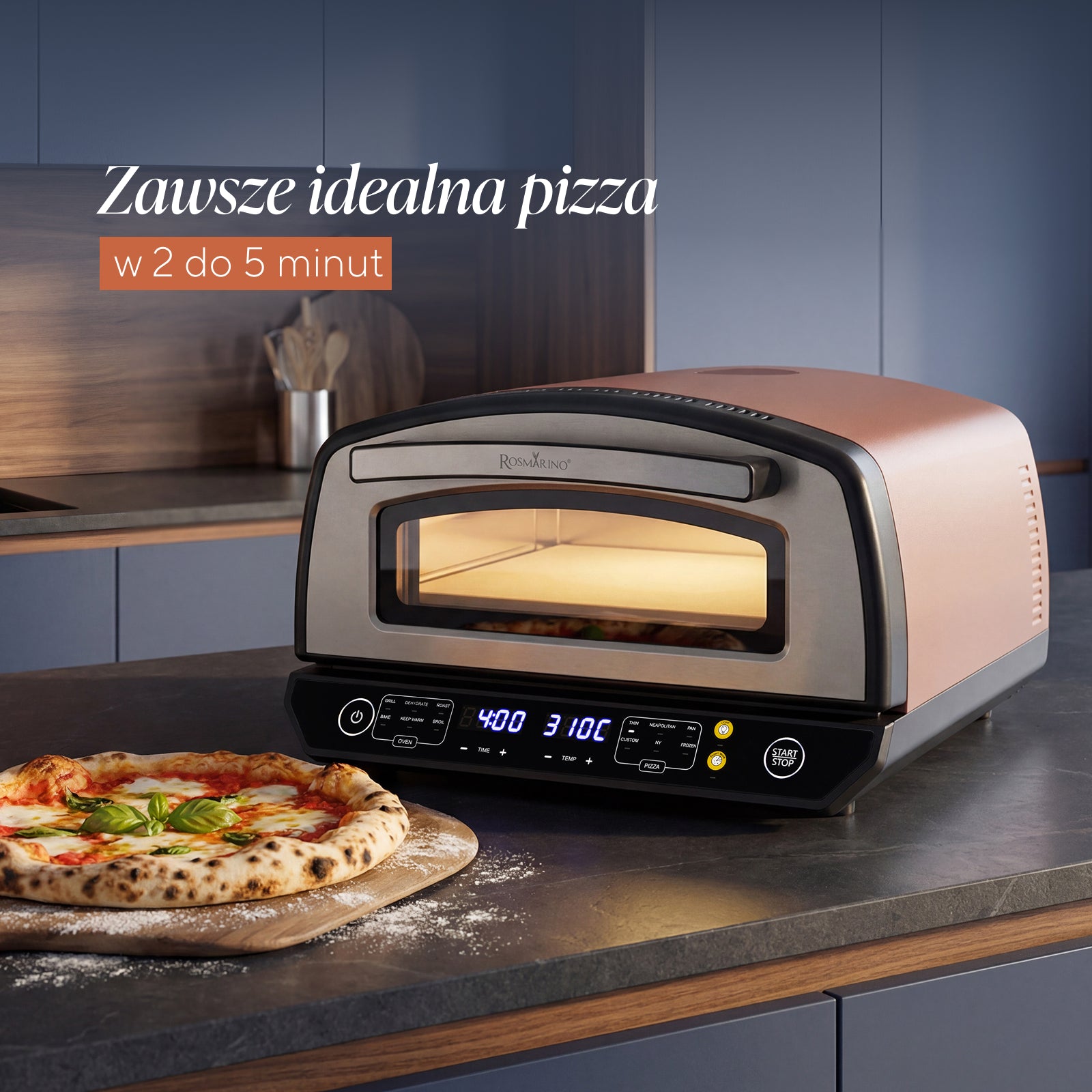 Zawsze idealna pizza jak z prawdziwej włoskiej pizzerii w 2 do 5 minut z elektrycznym piecem do pizzy Rosmarino Napoli PRO Series 12. Chrupiące ciasto, soczyste wnętrze i autentyczny smak!