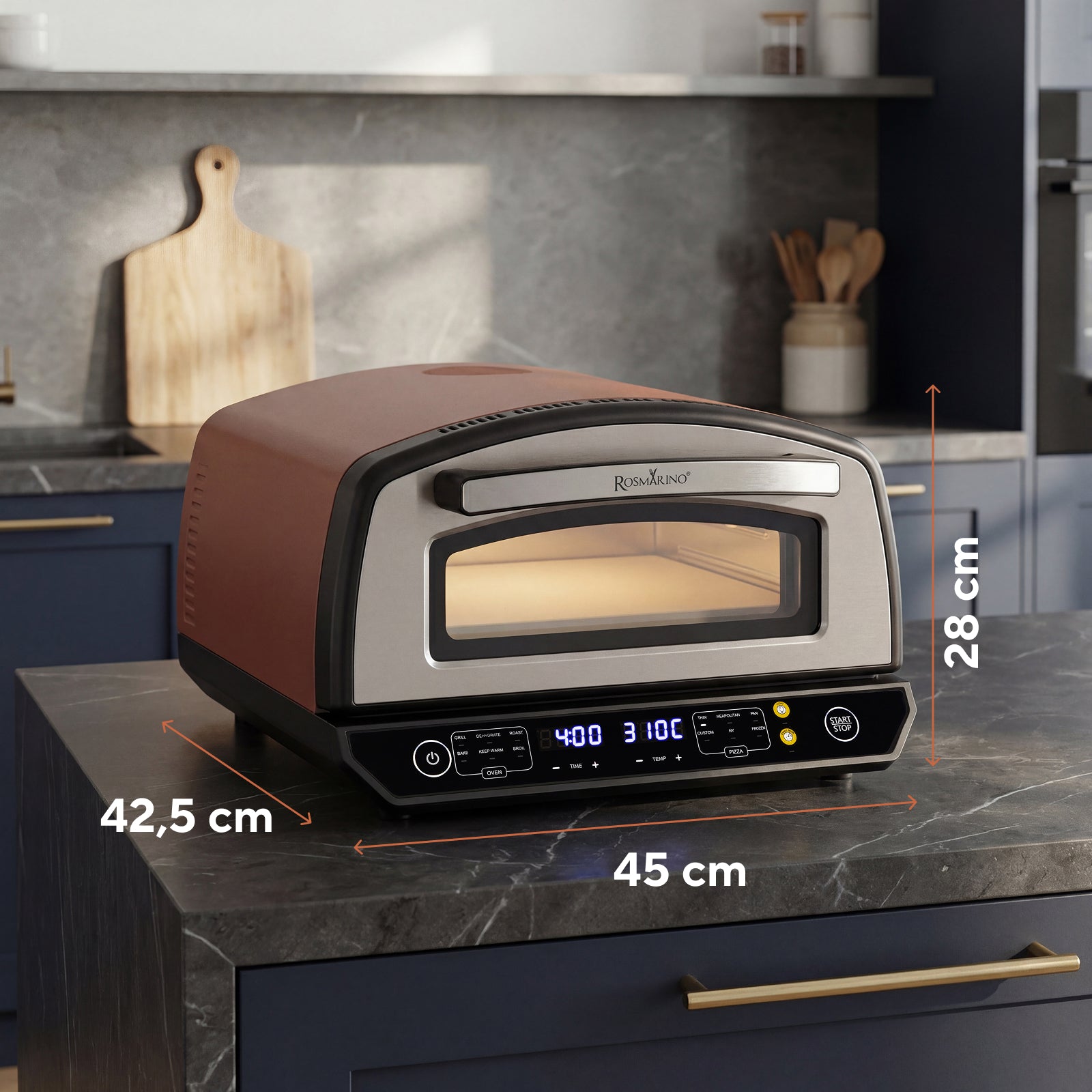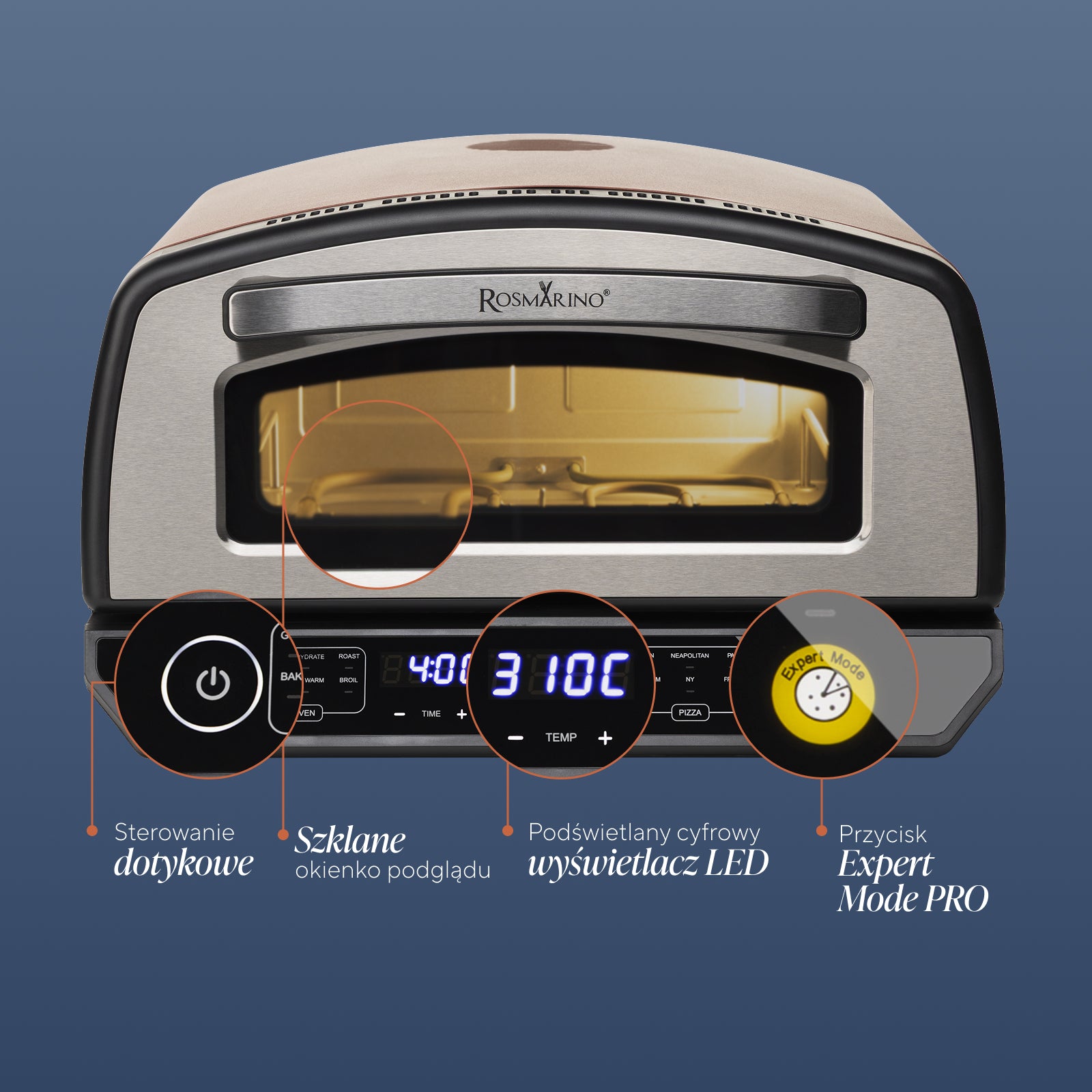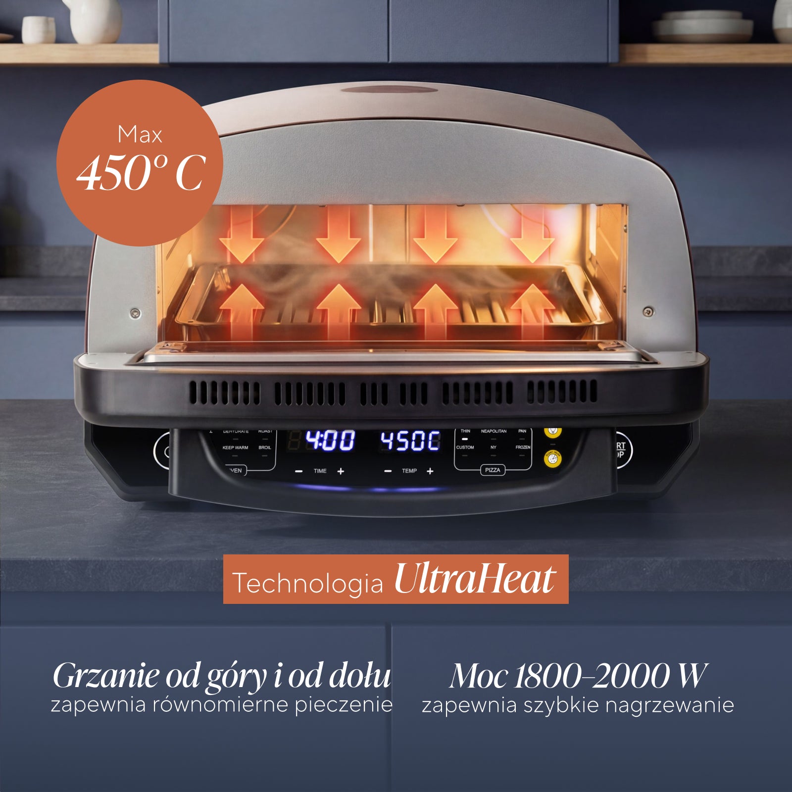 - Temperatura do 450 °C zapewnia autentyczną teksturę, której nie osiągną tradycyjne piekarniki