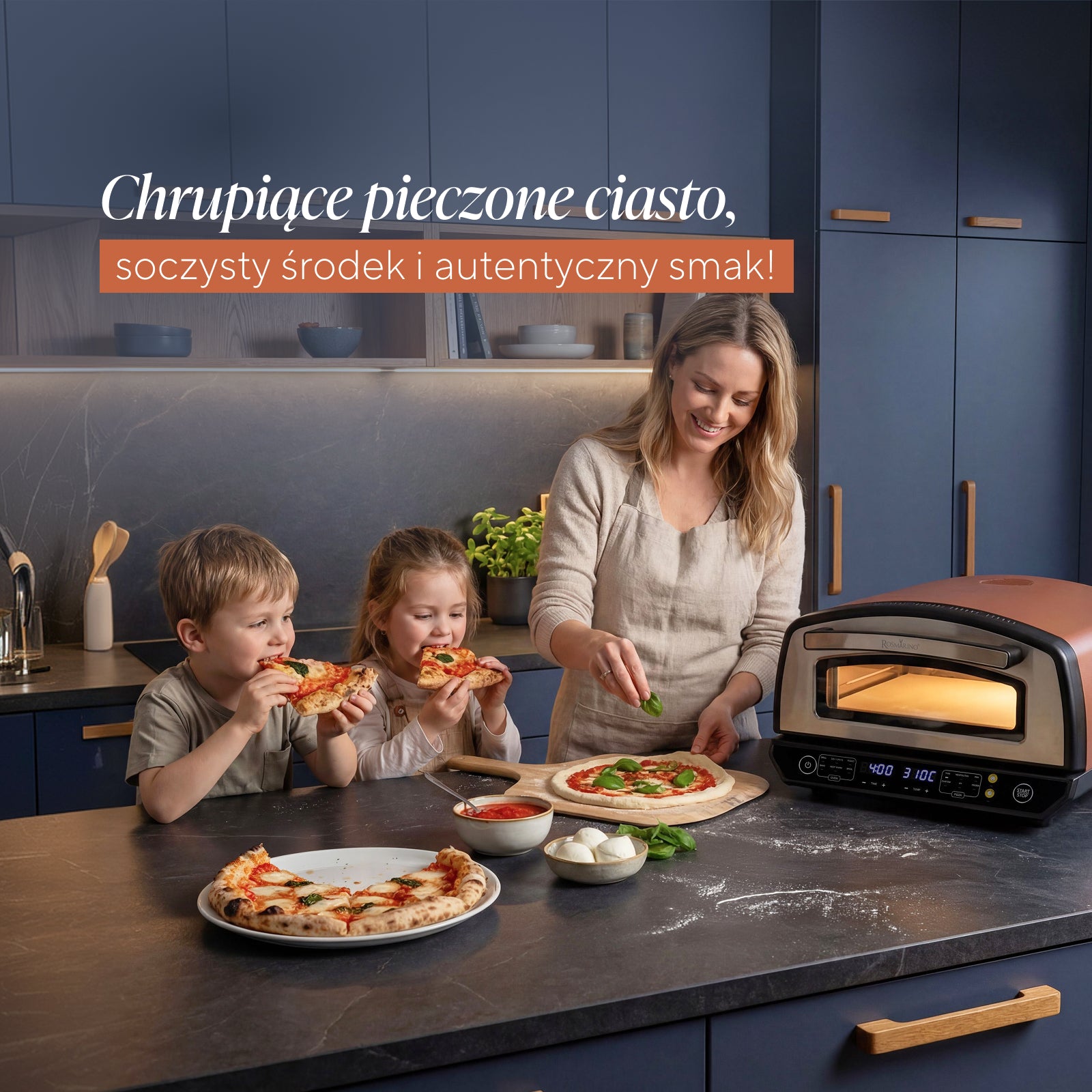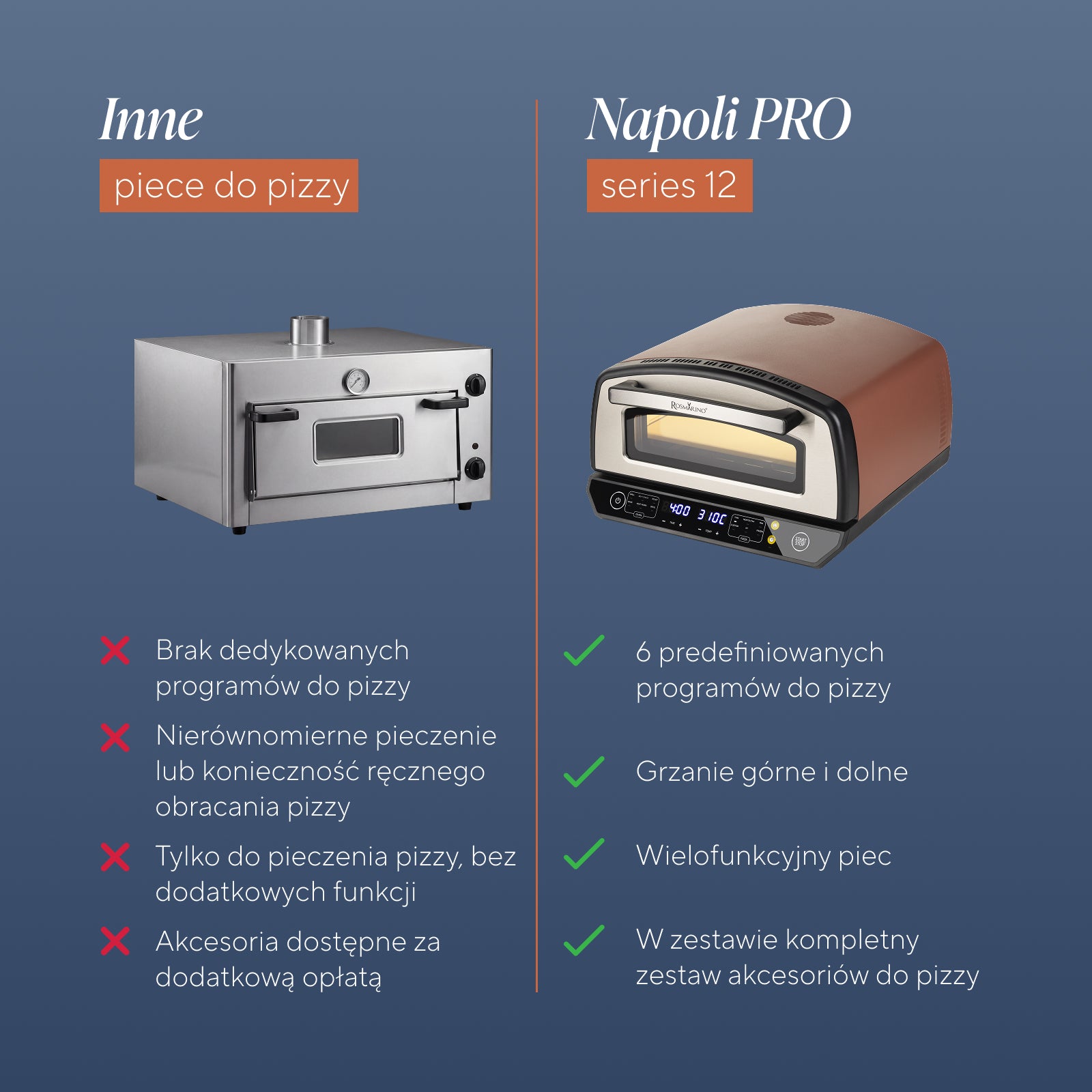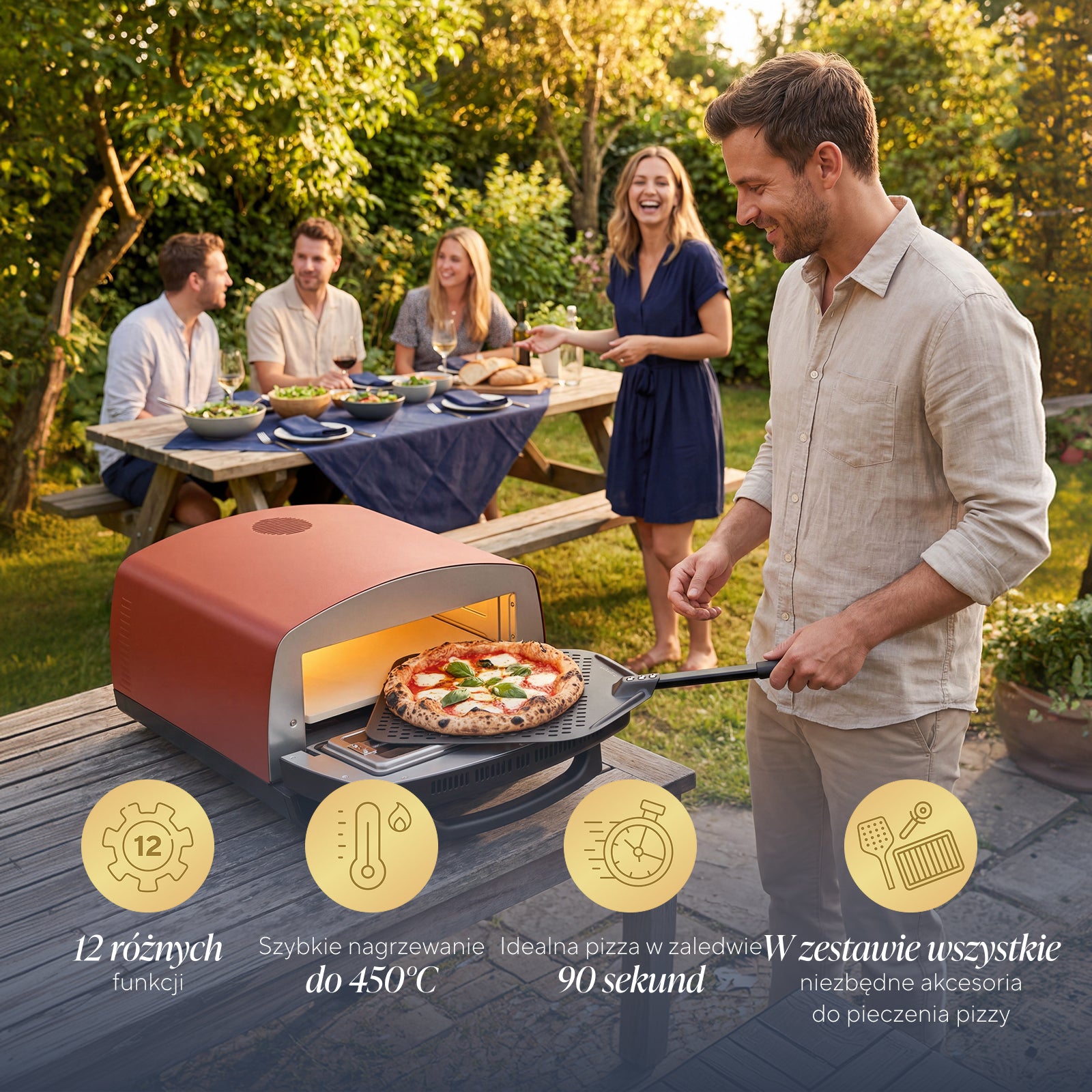 - Temperatura do 450 °C zapewnia autentyczną teksturę, której nie osiągną tradycyjne piekarniki