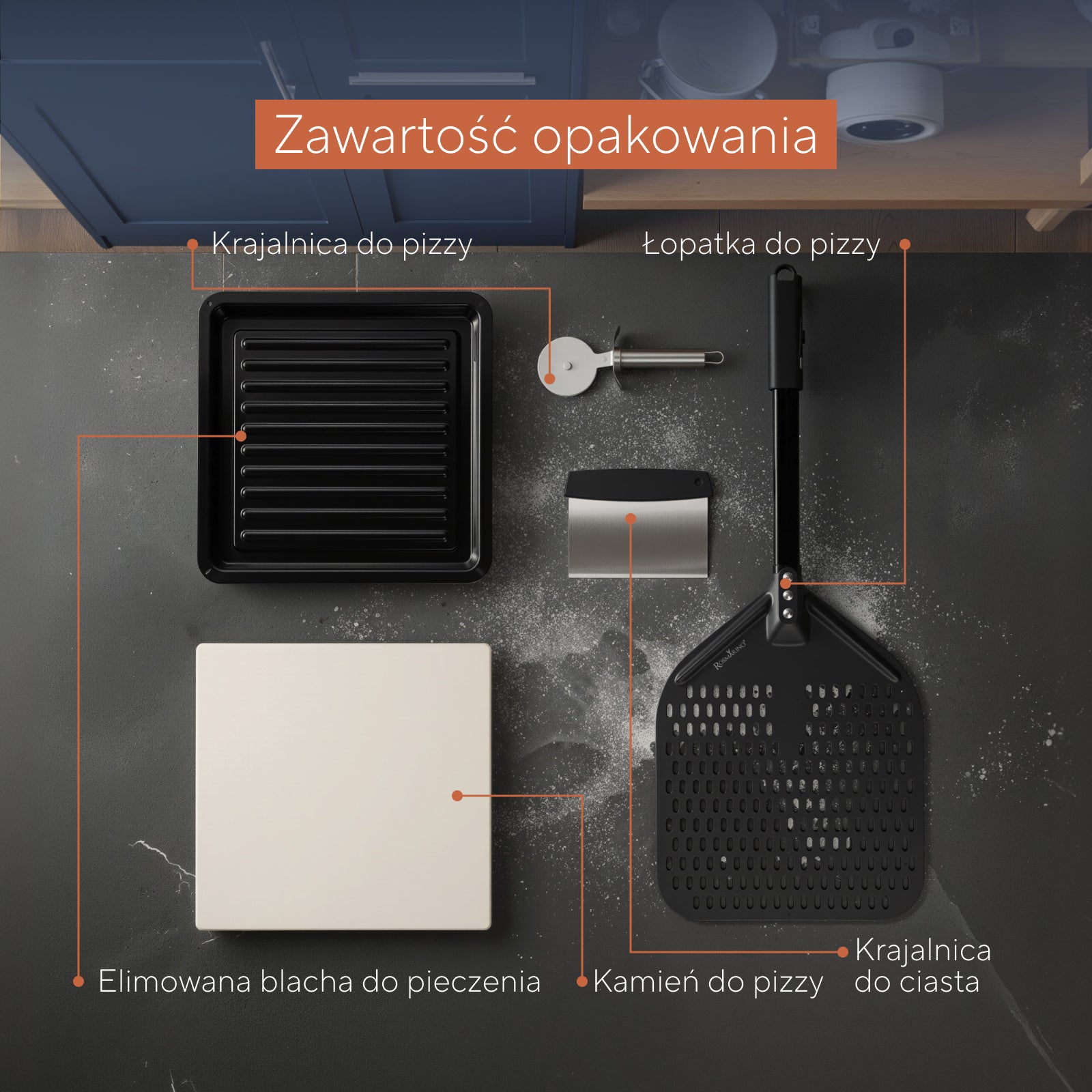 - W zestawie akcesoria: kamień do pizzy, emaliowana blacha, nóż do ciasta, łopatka do pizzy, nóż do pizzy