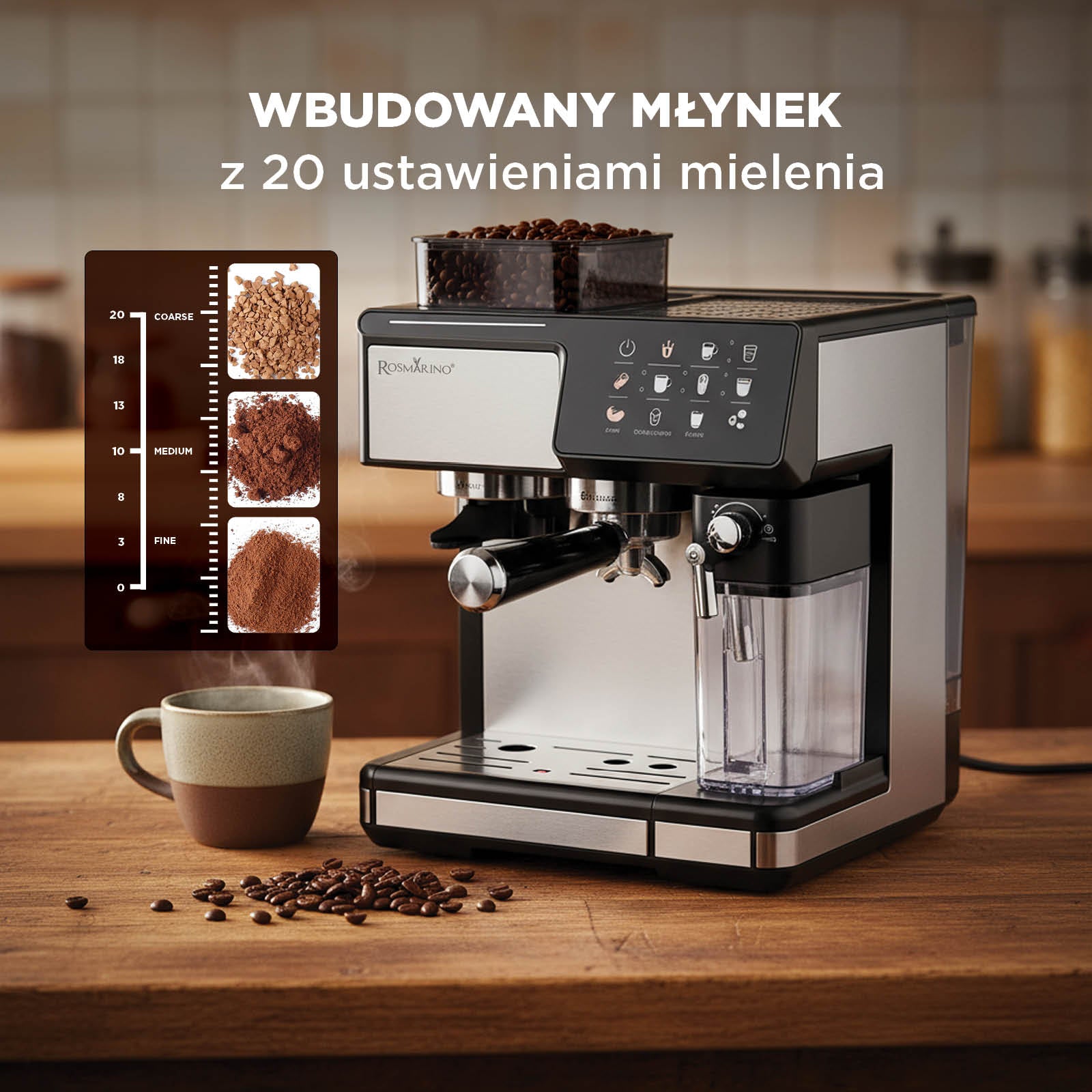 - Wbudowany młynek z 20 ustawieniami gwarantuje idealną świeżość każdej filiżanki.