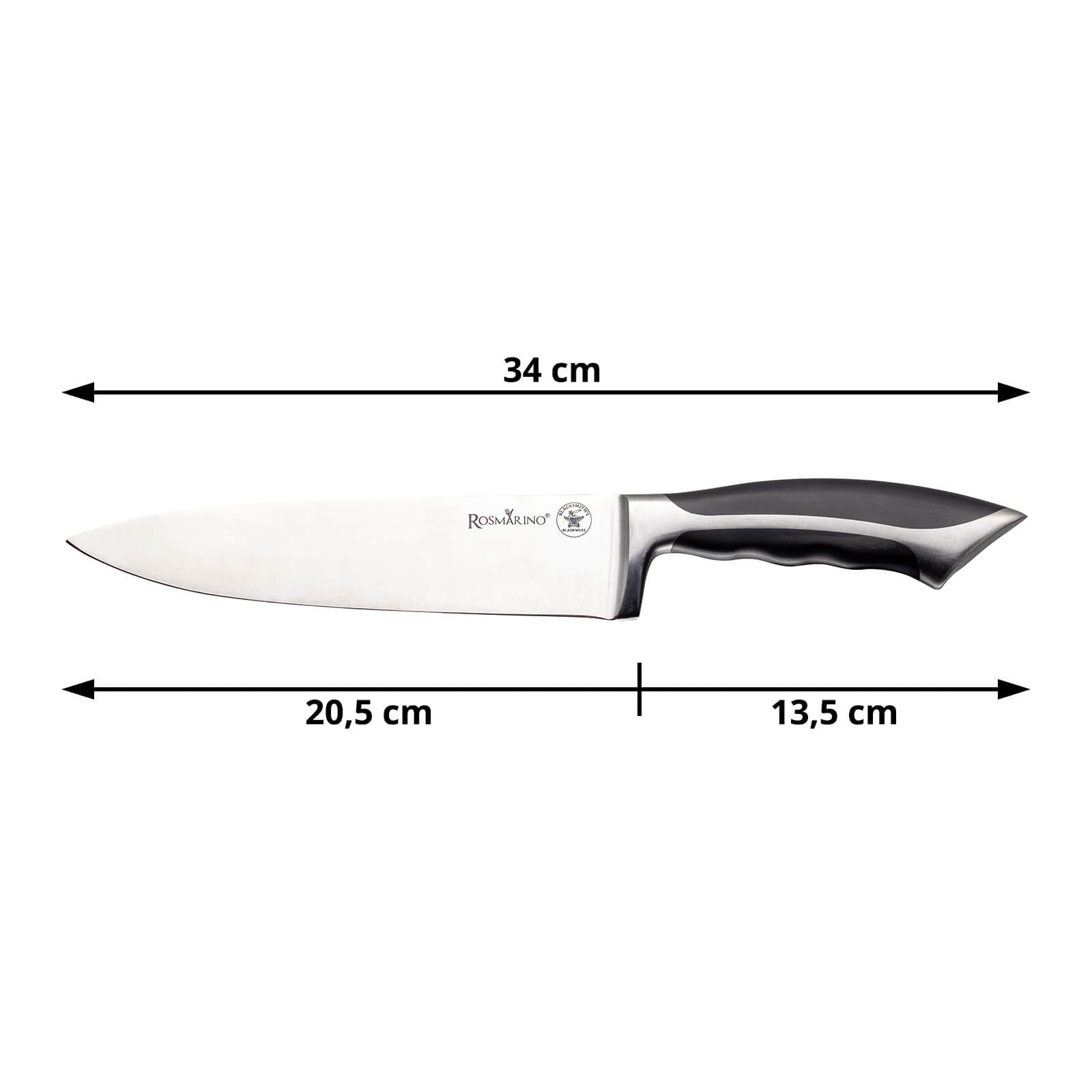 Doskonały nóż kuchenny Rosmarino Blacksmith's Chef dla wszystkich mistrzów kuchni i początkujących! Ten większy nóż dzięki swojemu kształtowi jest idealny do krojenia różnorodnych produktów. Ostrze wykonane jest z nierdzewnej stali wysokiej jakości pochodzenia niemieckiego, a wytrzymała rękojeść z wysokiej jakości tworzywa ABS pozwala na maksymalne obciążenia. Profesjonalna ostrość pomoże Państwu szybko i precyzyjnie kroić większe i mniejsze kawałki produktów. Zalety noża to obustronnie ręcznie ostrzone ostrze pod kątem 15° zapewniające długotrwałą ostrość i wytrzymałość. Dzięki specjalnemu szlifowi nóż jest dodatkowo odporny na korozję, rdzę i plamy. Nóż łatwo wyczyścić pod bieżącą wodą z odrobiną detergentu.