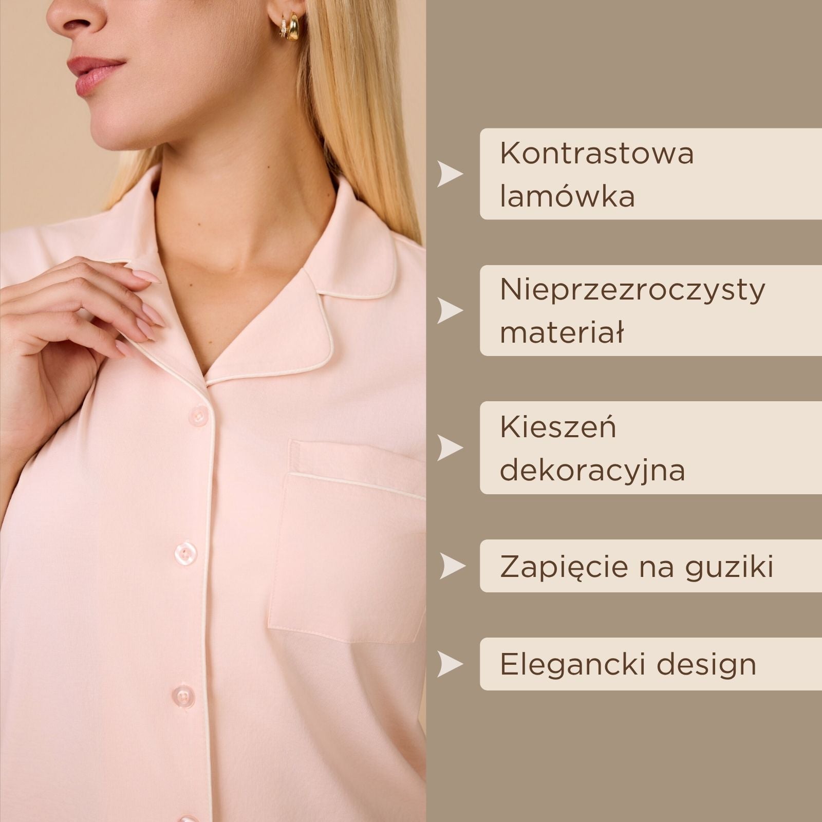 • Kołnierzyk koszulowy z dekoltem w serek, zapięcie na guziki i kieszeń na piersi