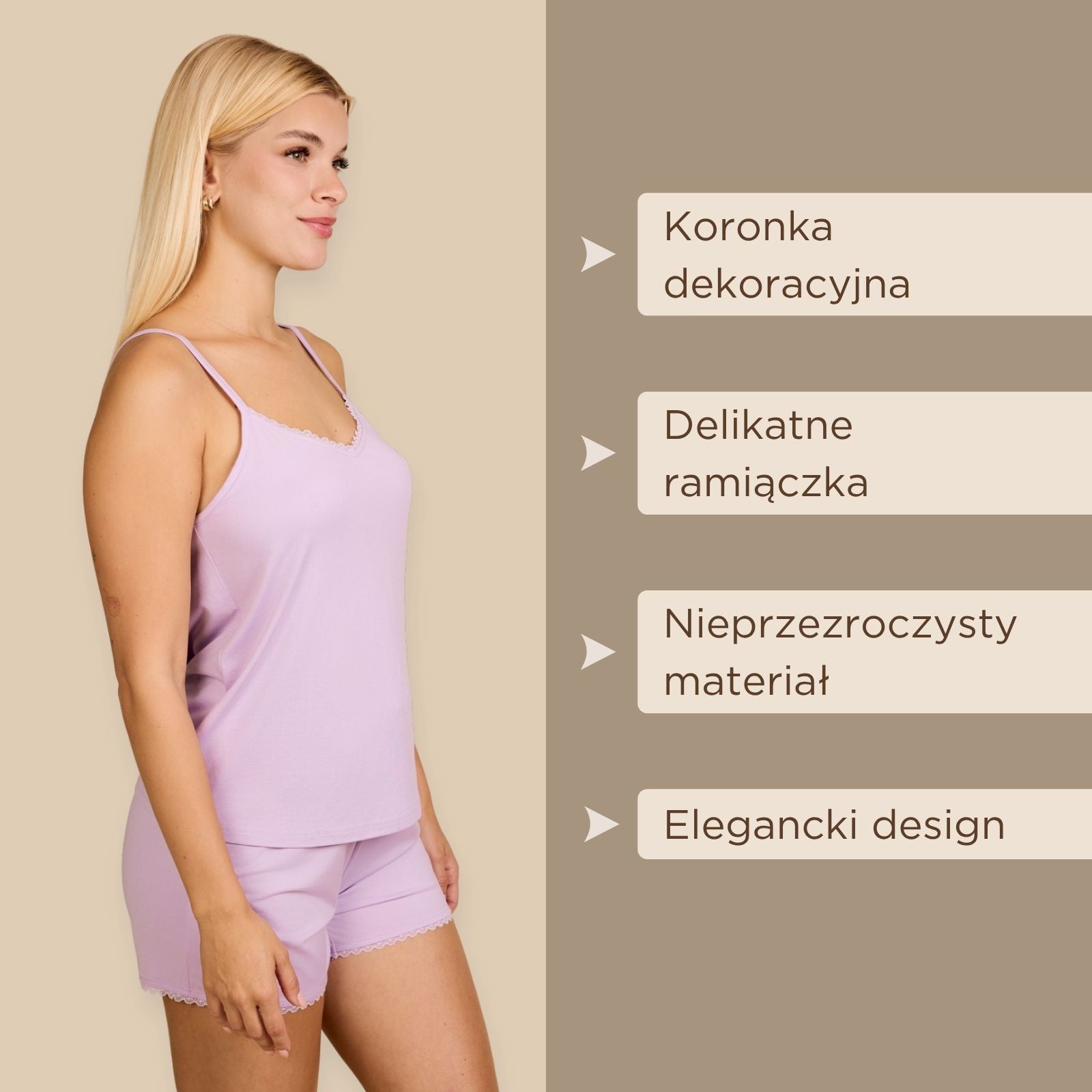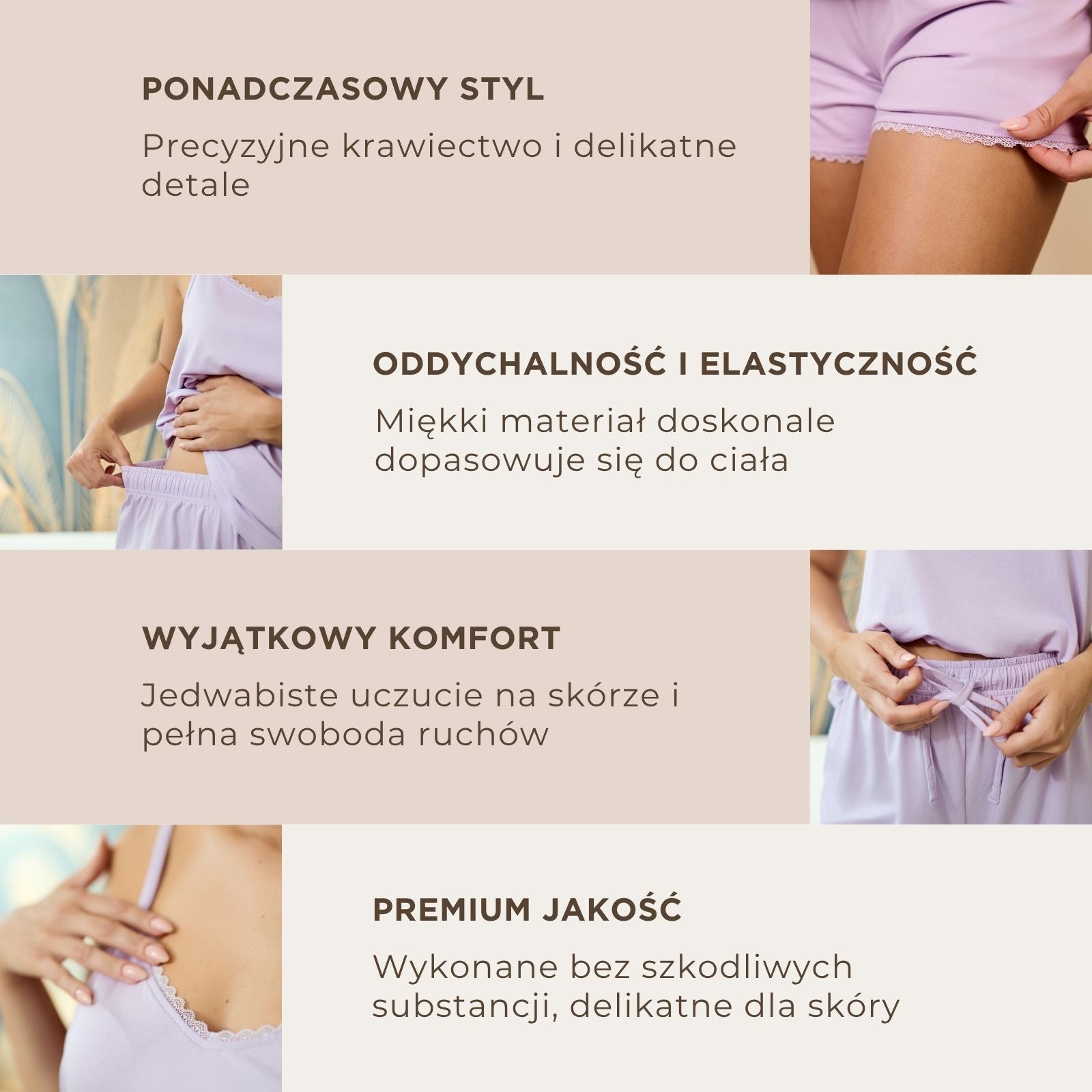 • Delikatne ramiączka i wyrafinowana koronka przy dekolcie oraz u dołu szortów